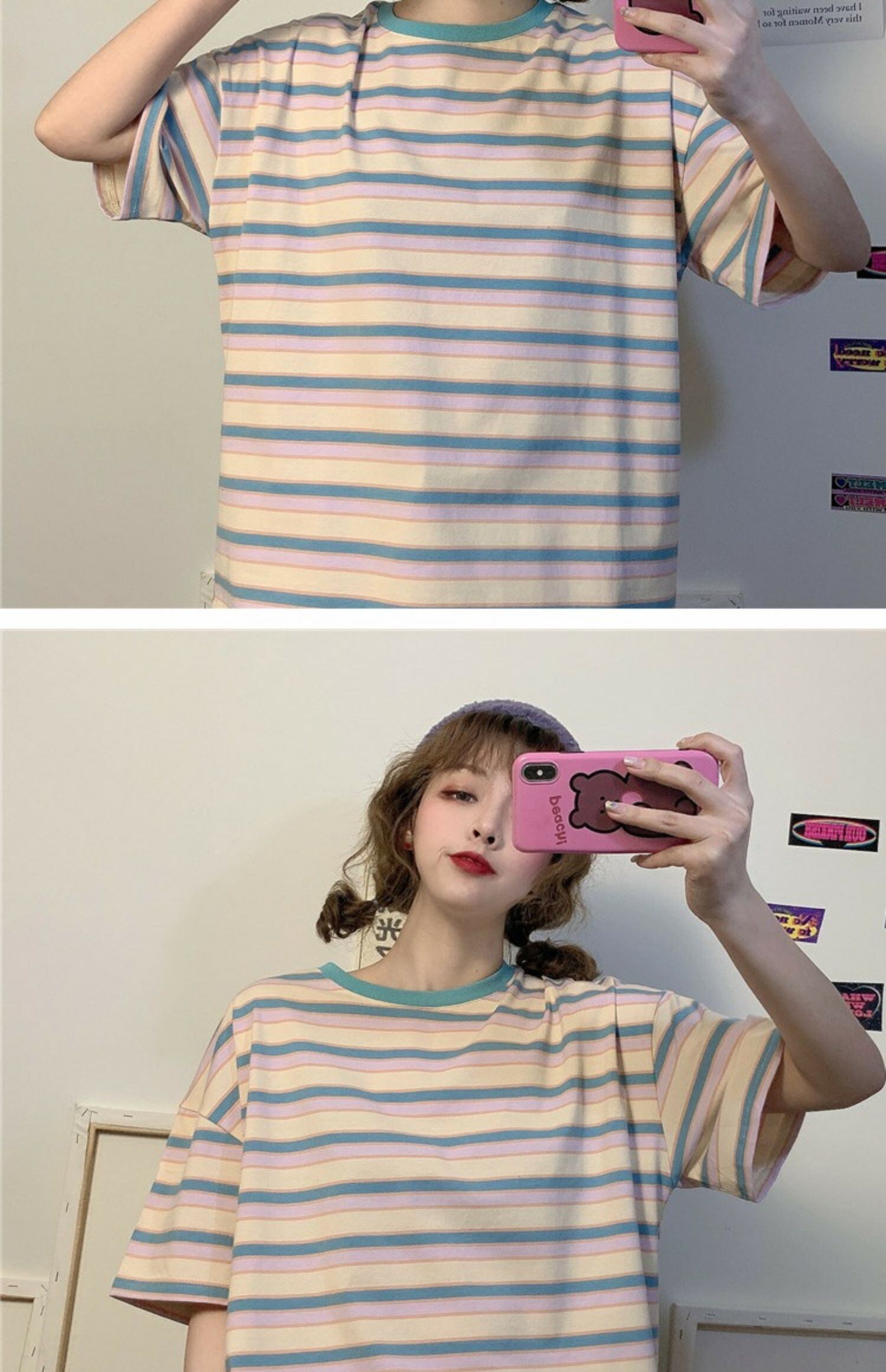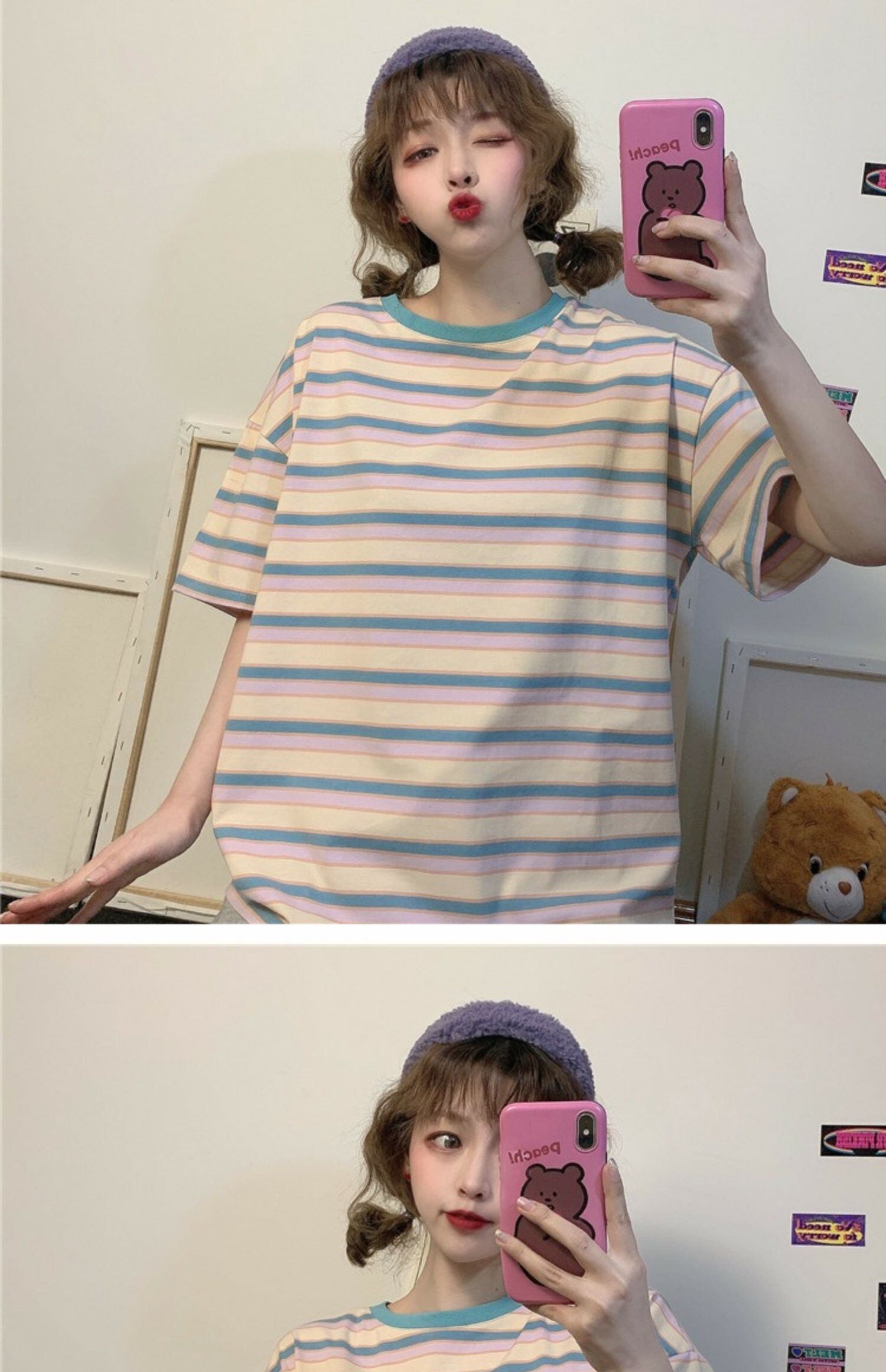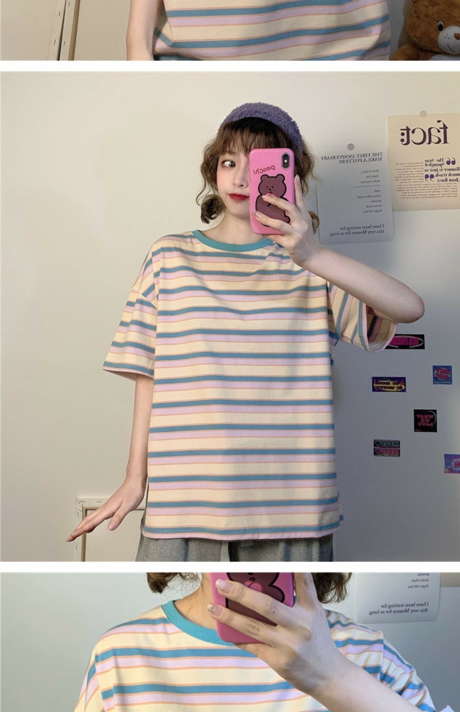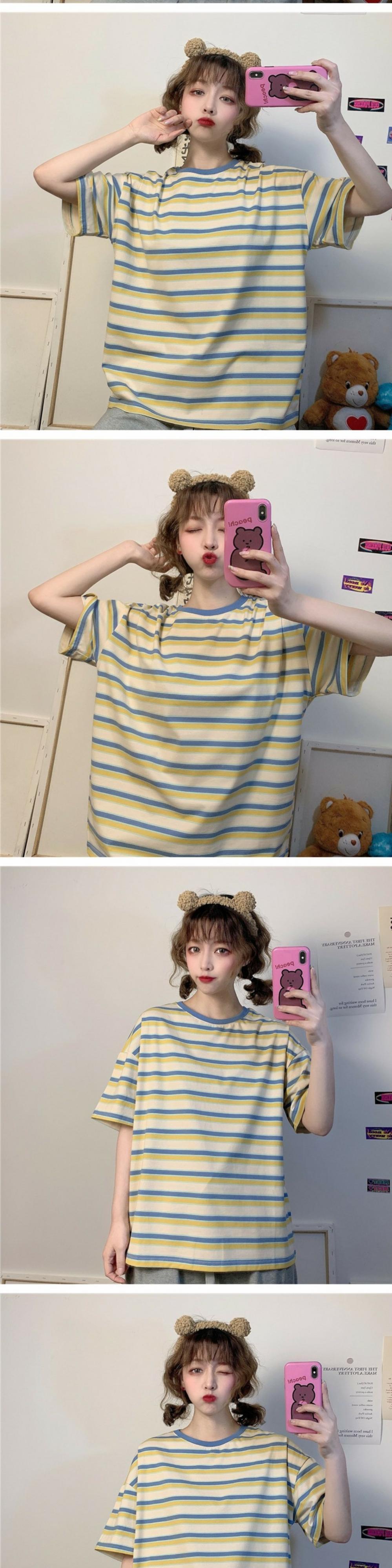 サマーラウンドネックルーズTシャツ ストライプトップス 夏物 Oネック 萌量不足10372909941