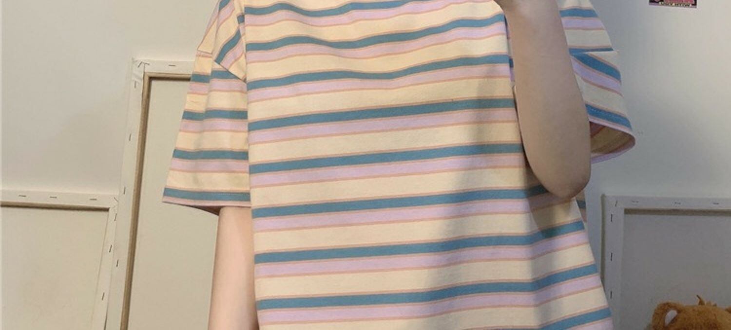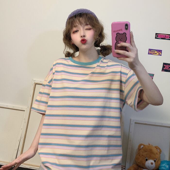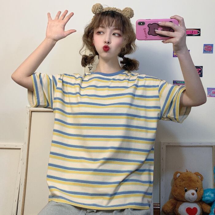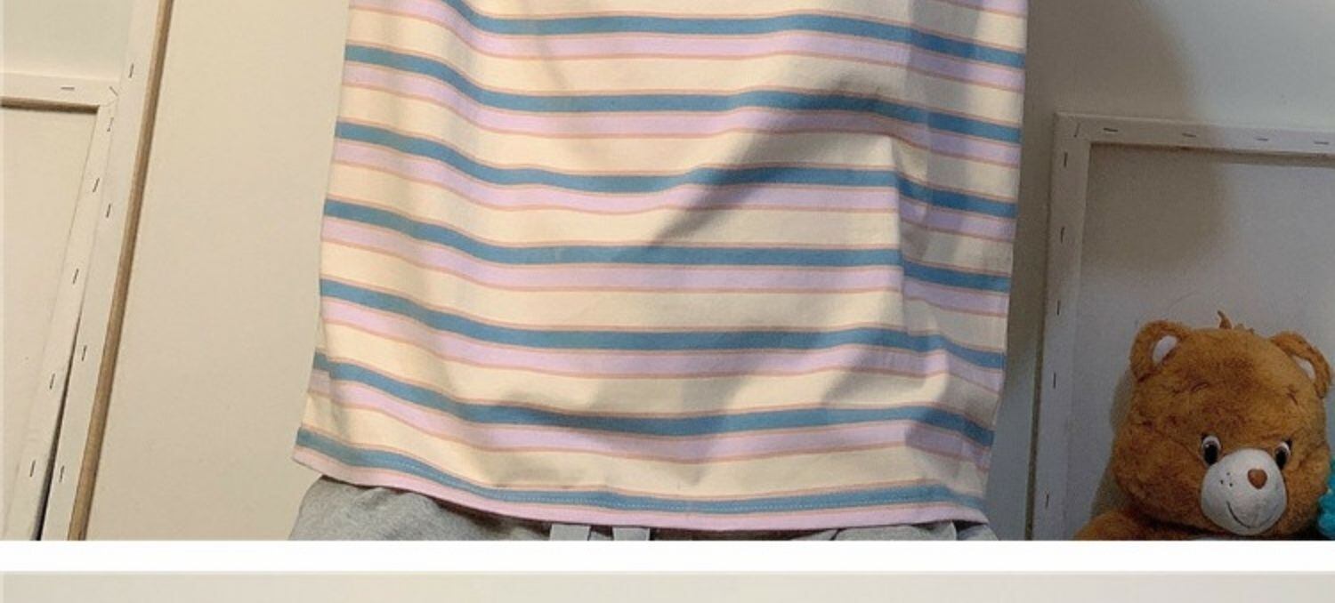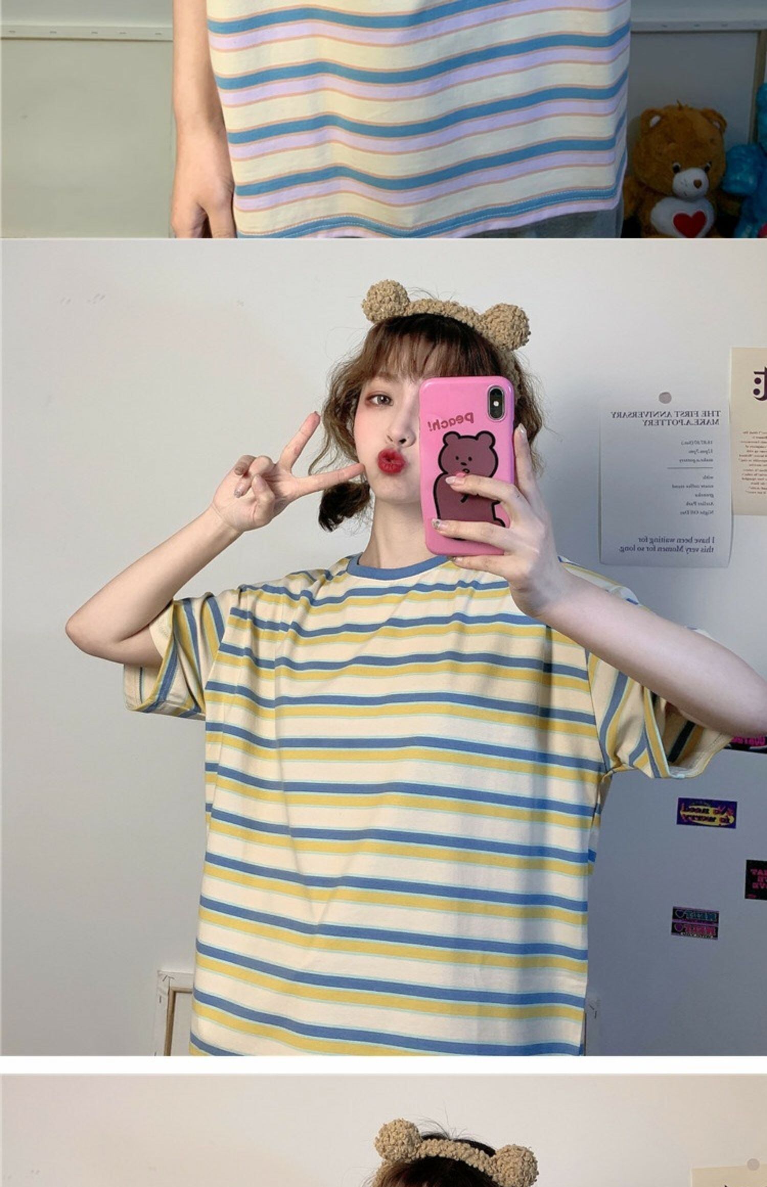サマーラウンドネックルーズTシャツ ストライプトップス 夏物 Oネック 萌量不足10372909941