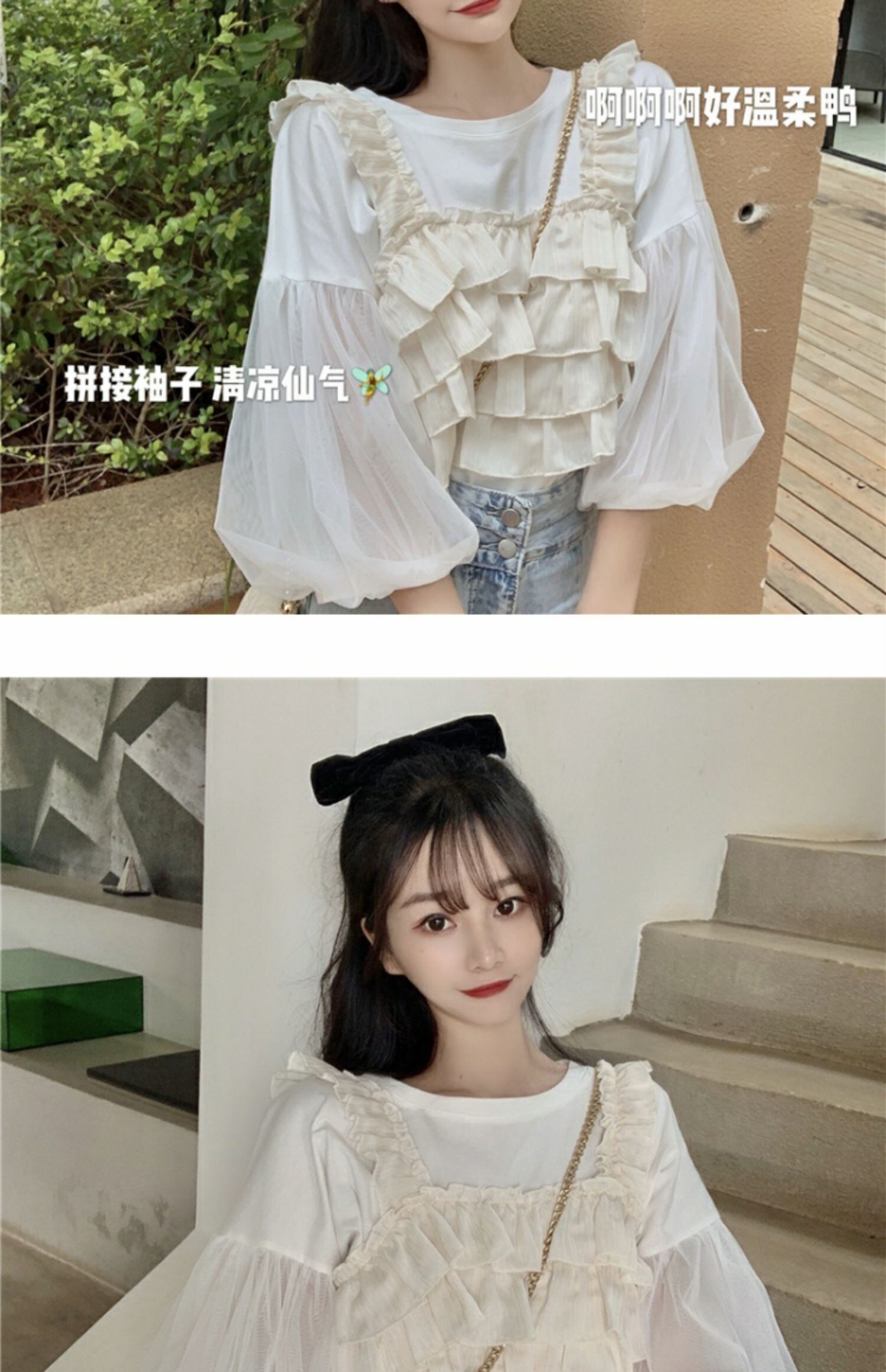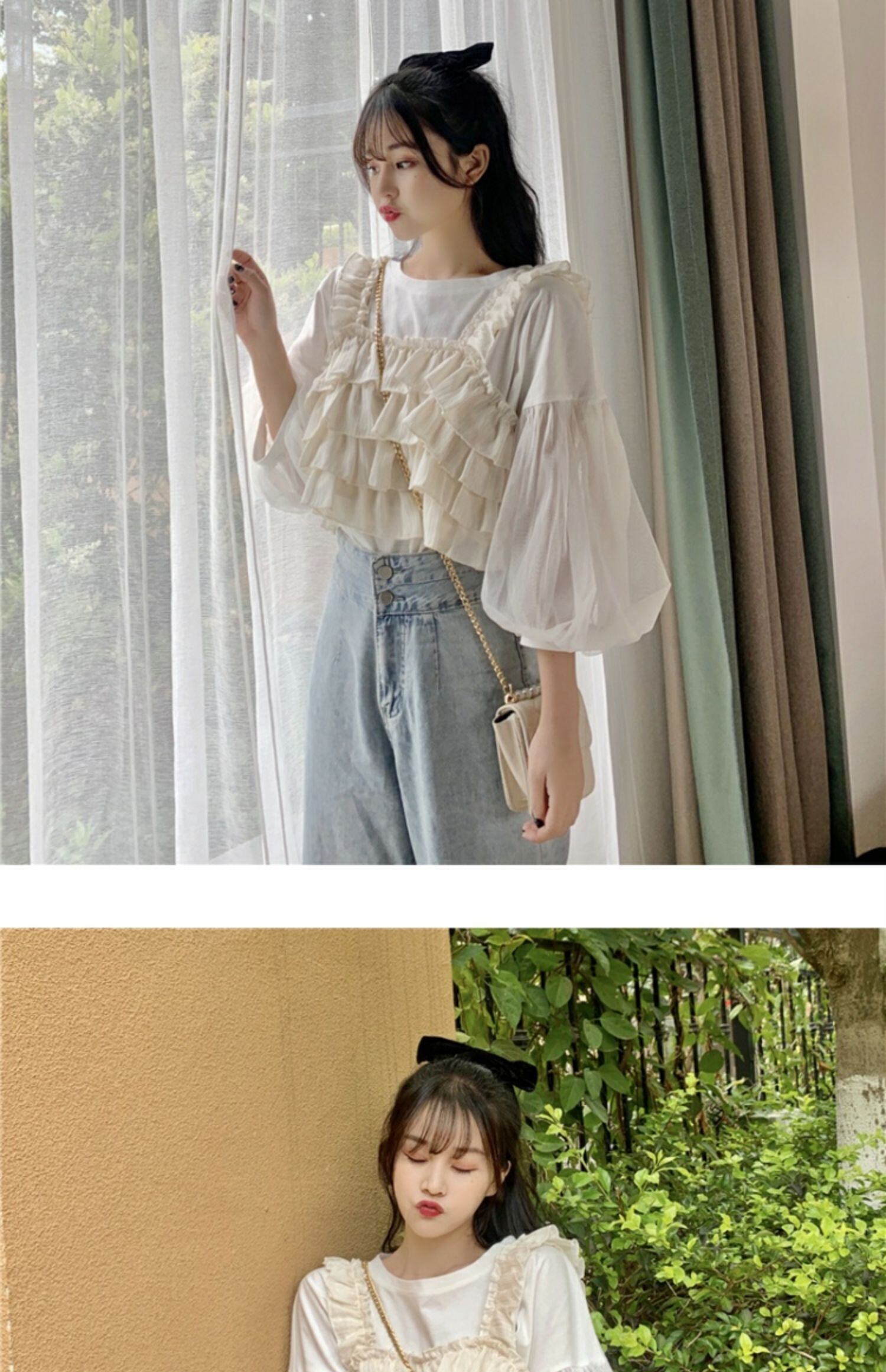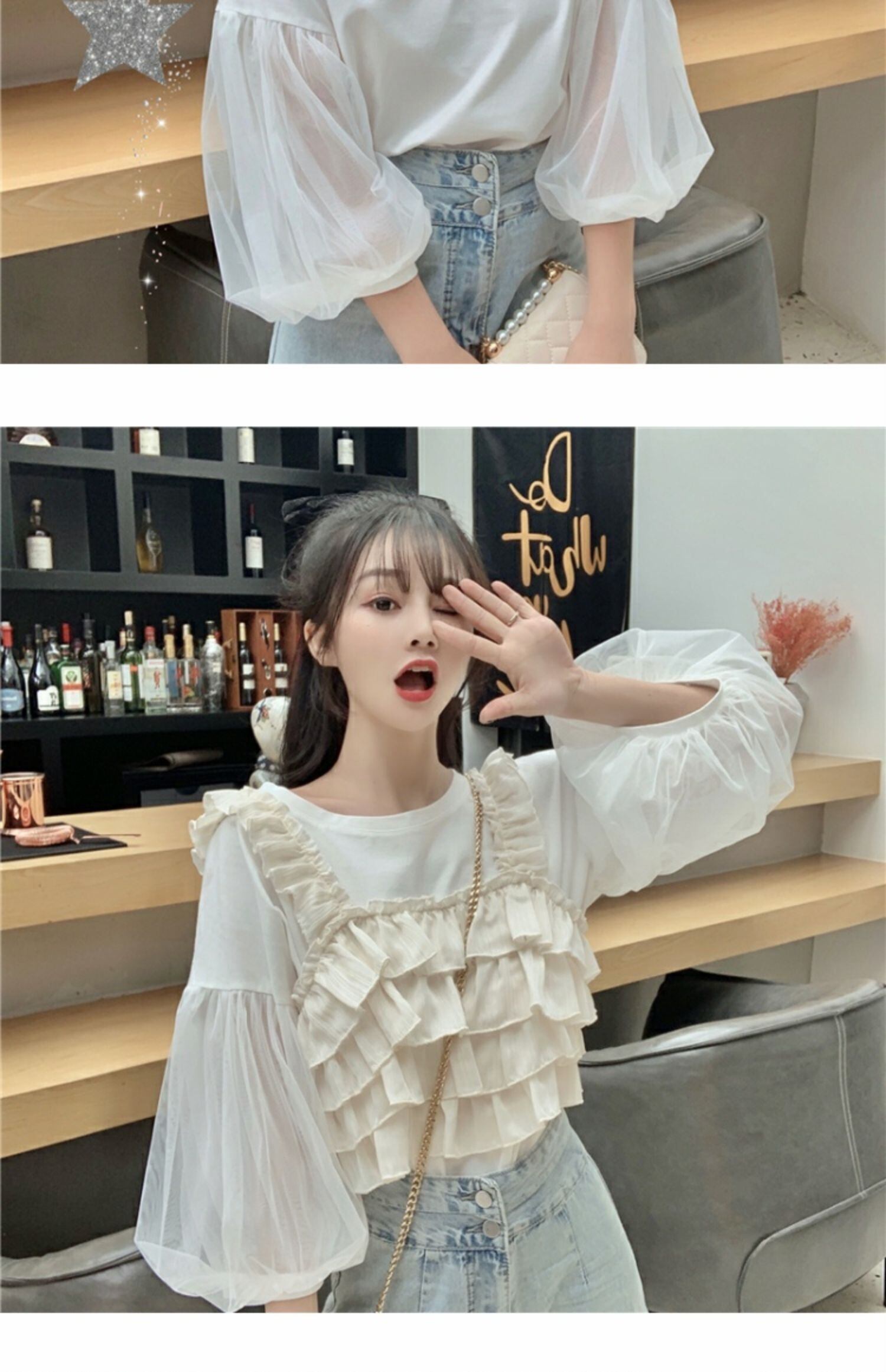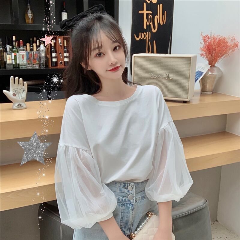 メッシュラウンドネックスリーブトップス サマーソリッド カラーTシャツ レディース ランタンスリーブ 夏物 Oネック ソリッドカラー ステッチ 萌量不足54892307557