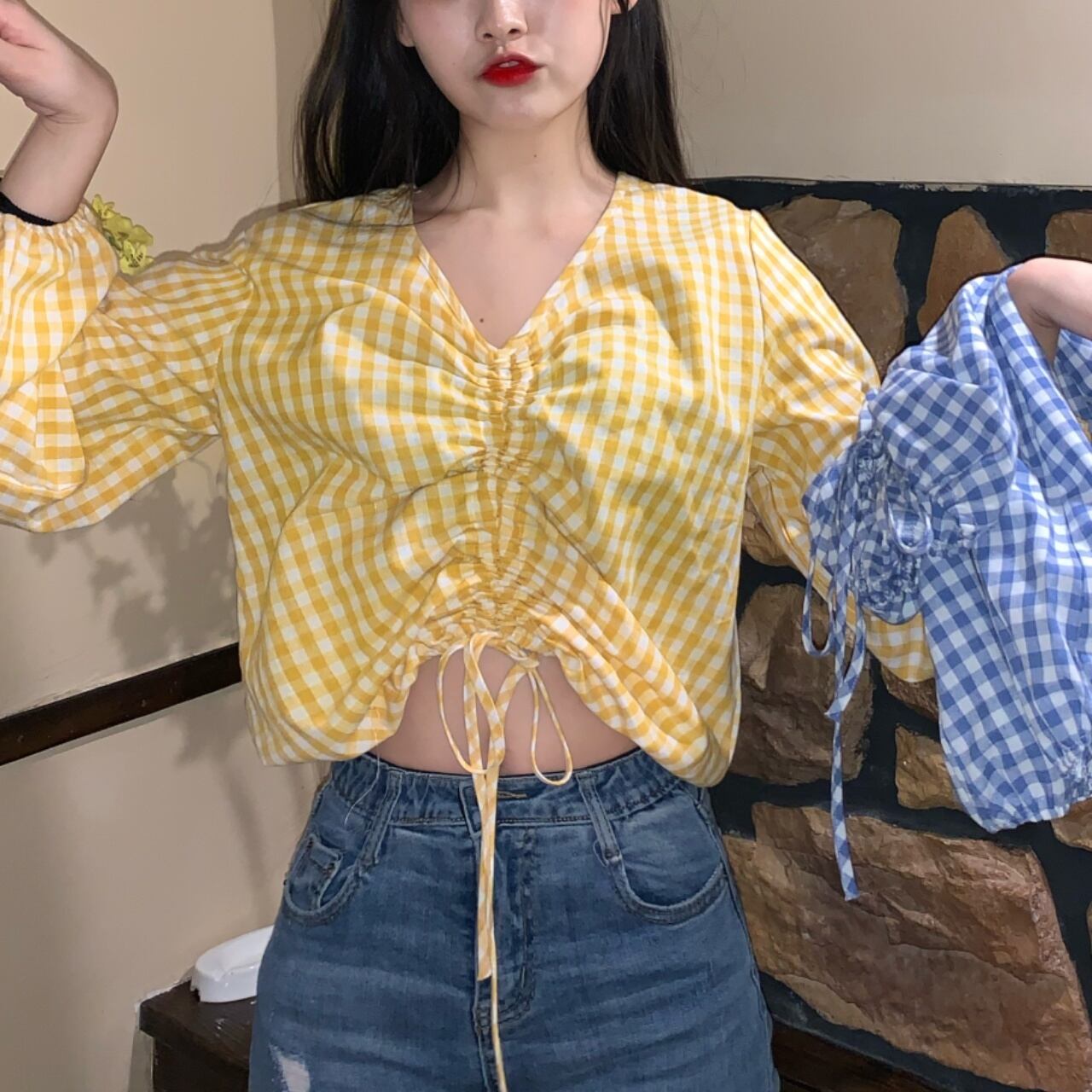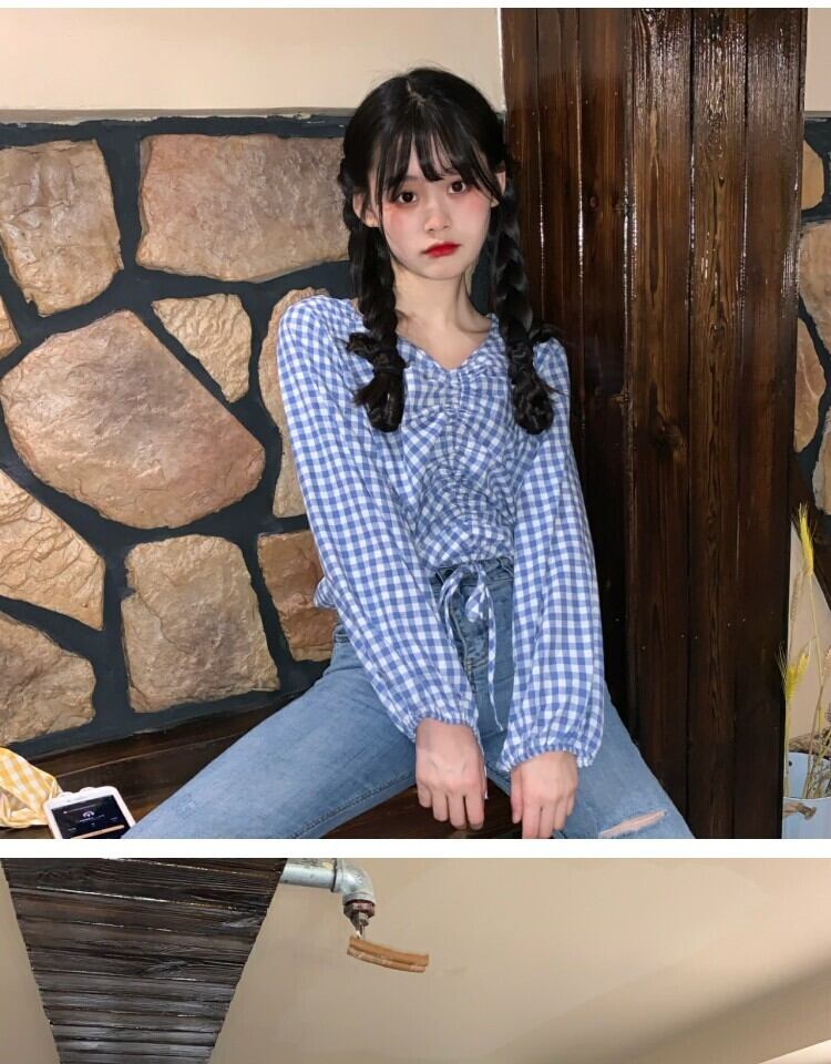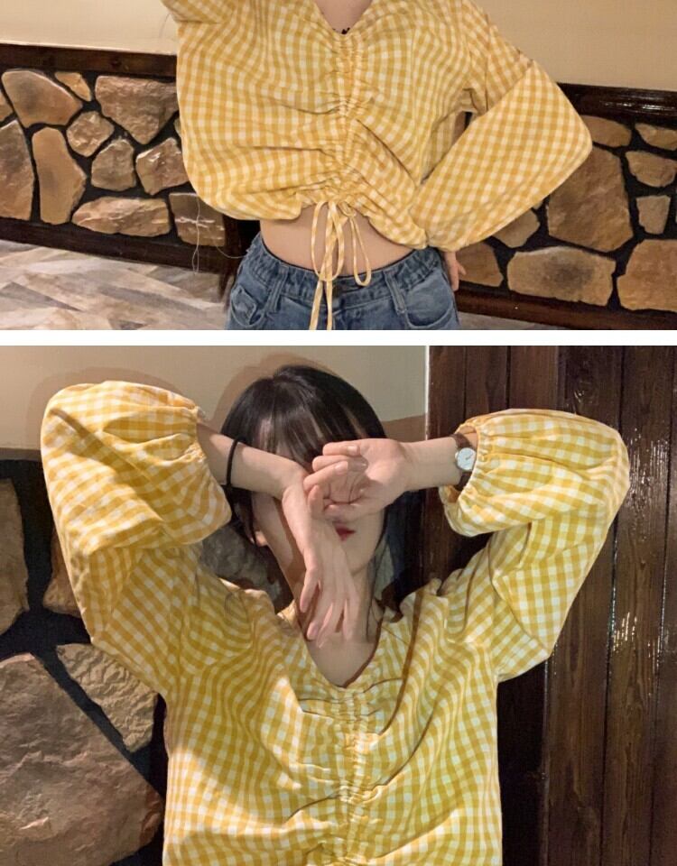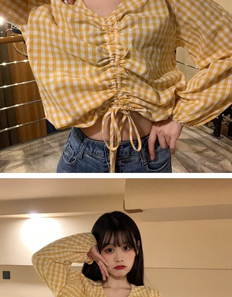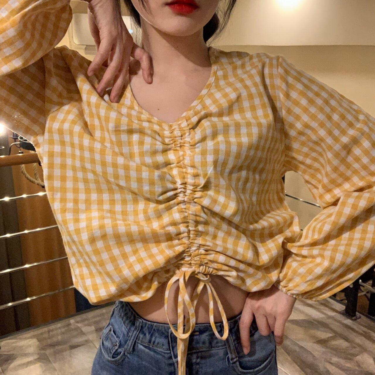 シャツ スプリングルーズ薄手格子柄ギャザーブラウス ショートレディース ロング 春物 萌量不足23603024189