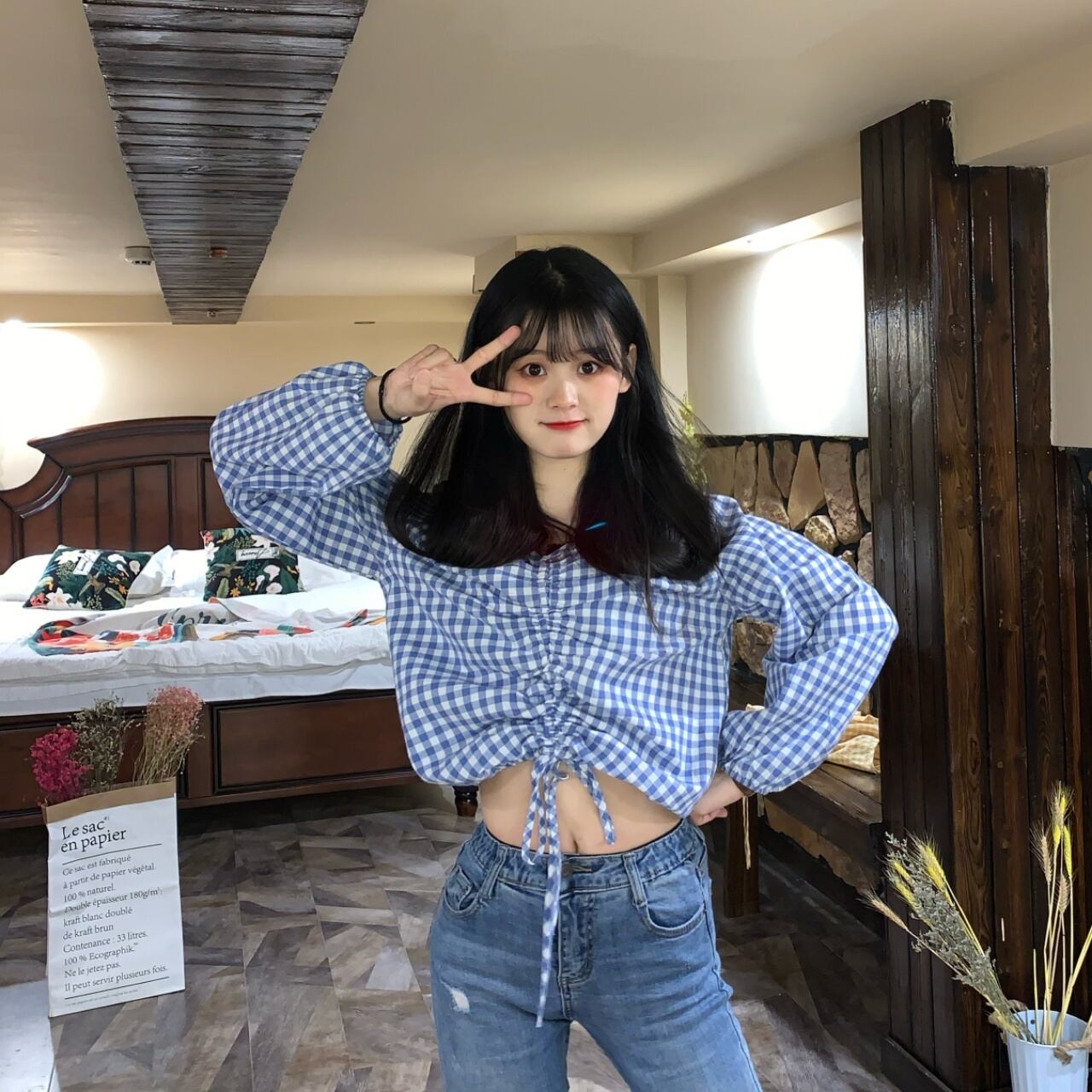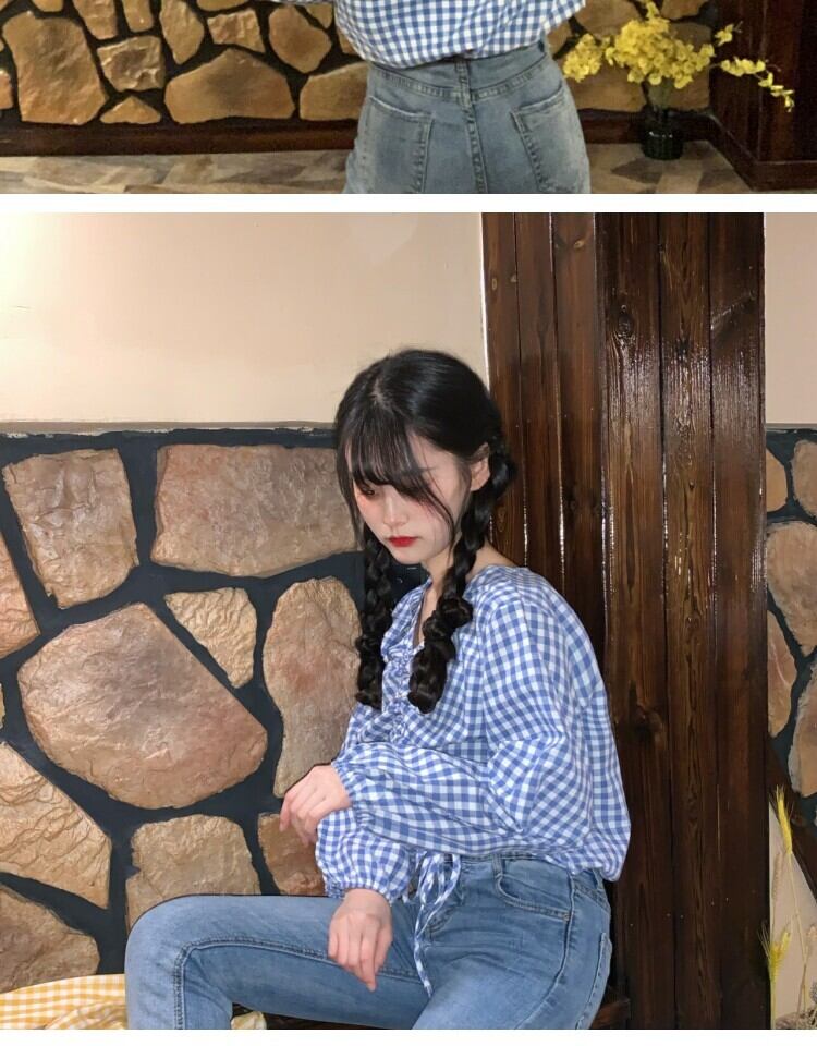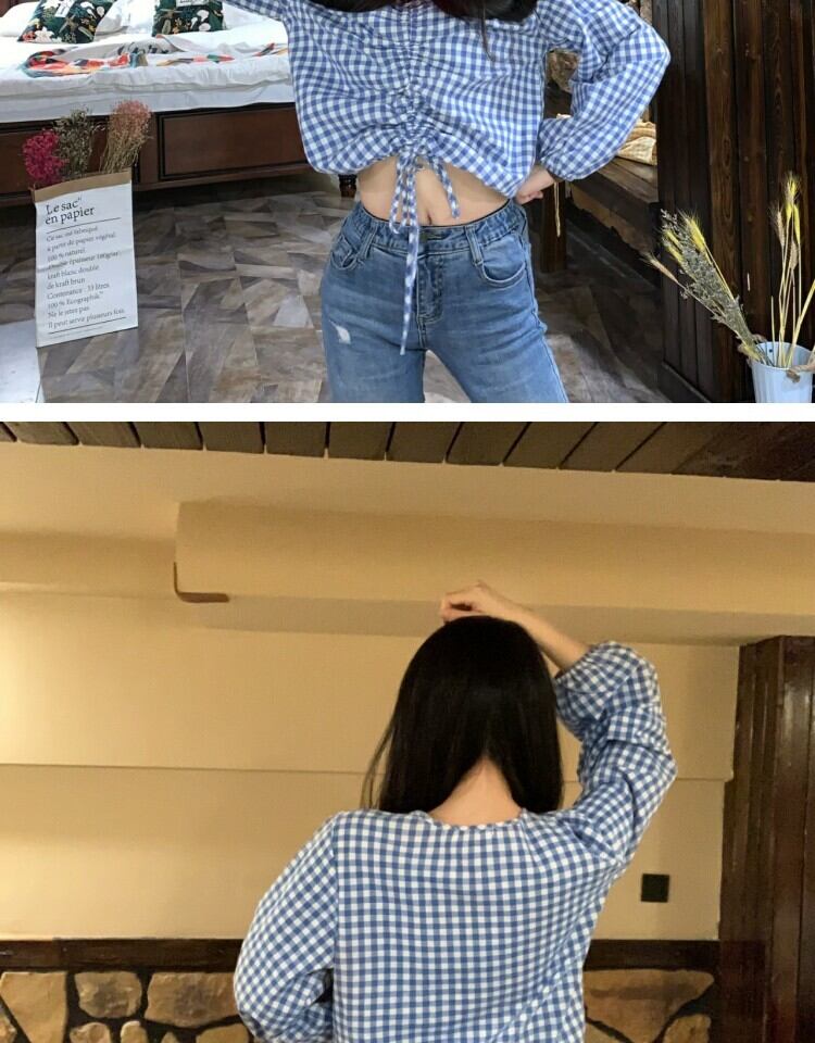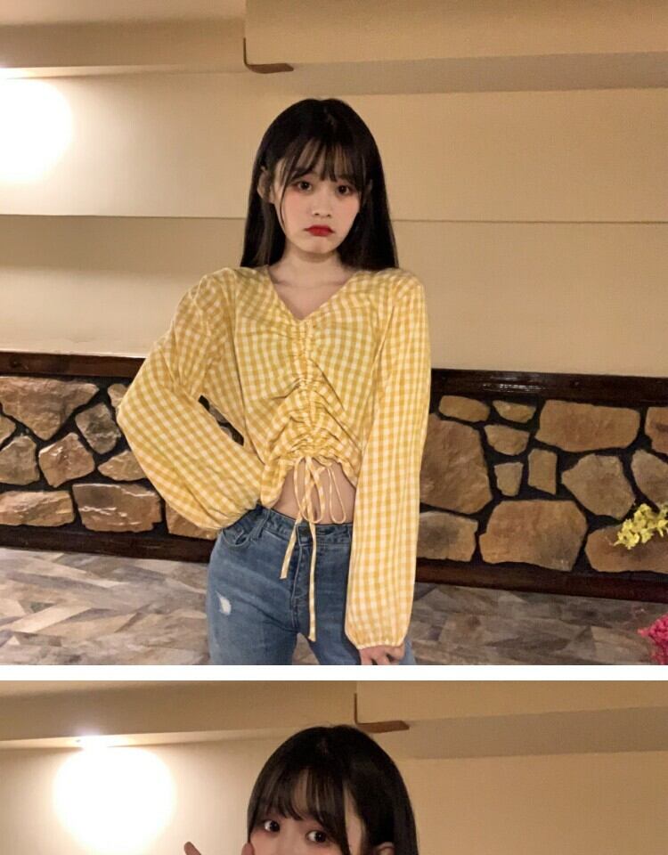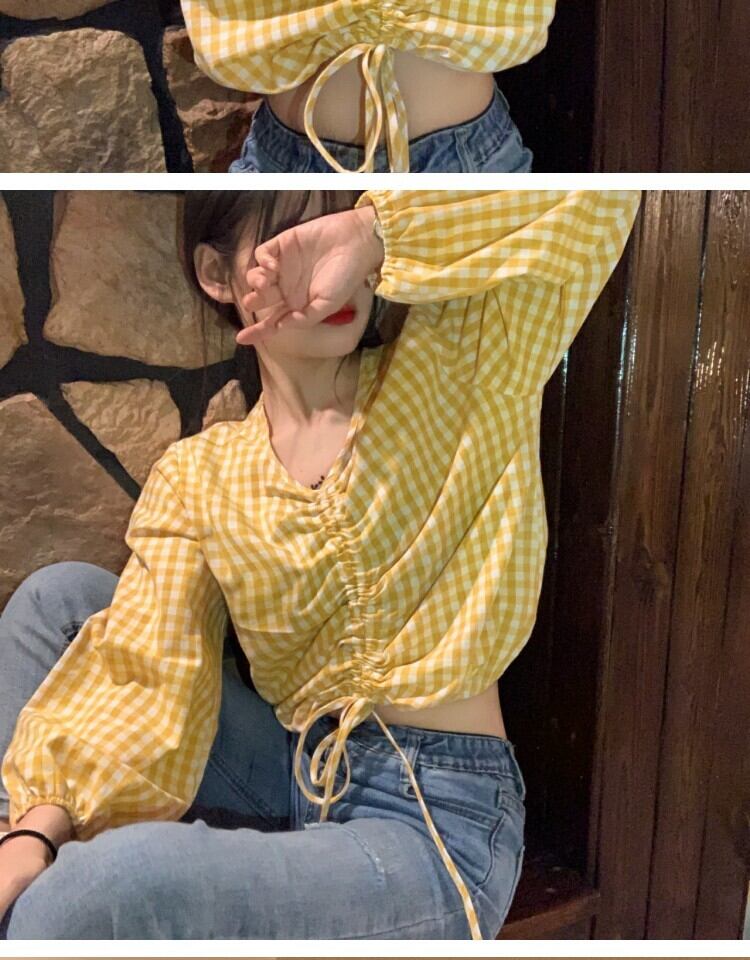 シャツ スプリングルーズ薄手格子柄ギャザーブラウス ショートレディース ロング 春物 萌量不足23603024189