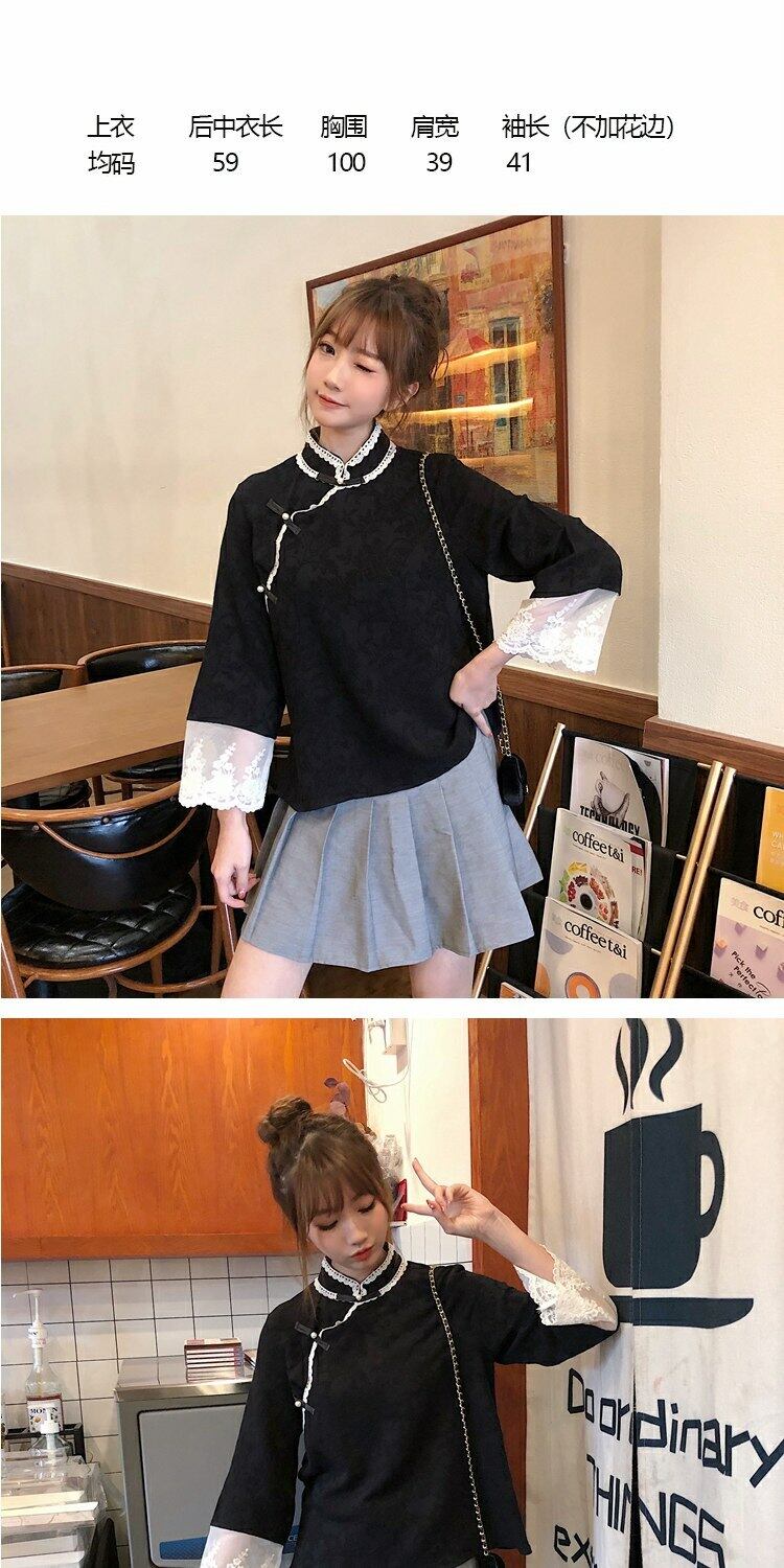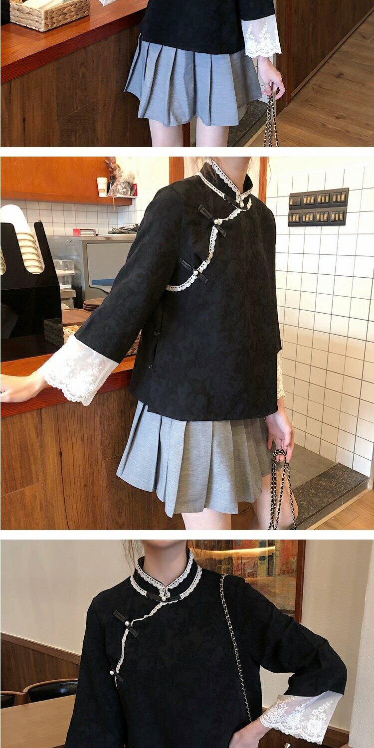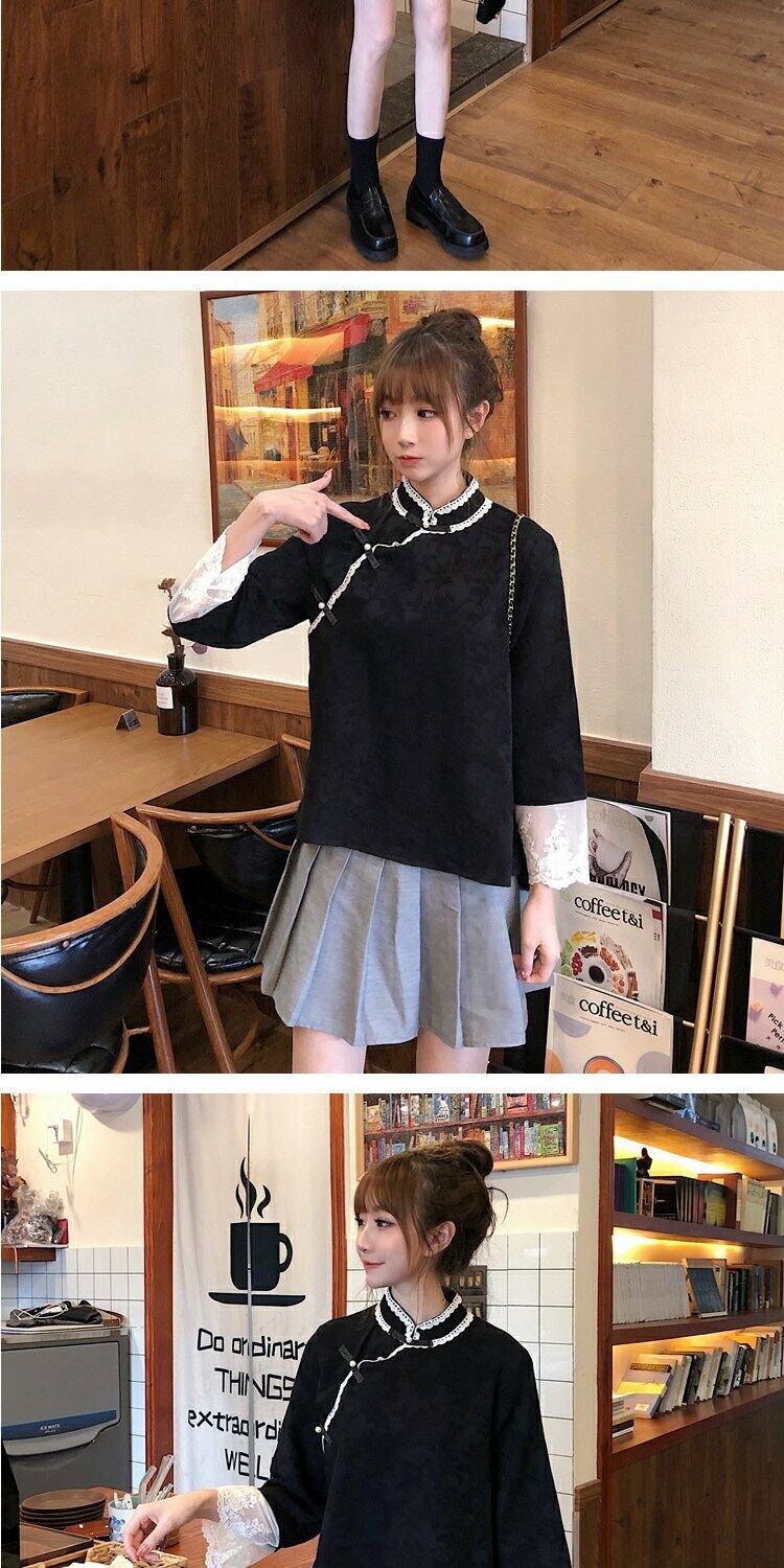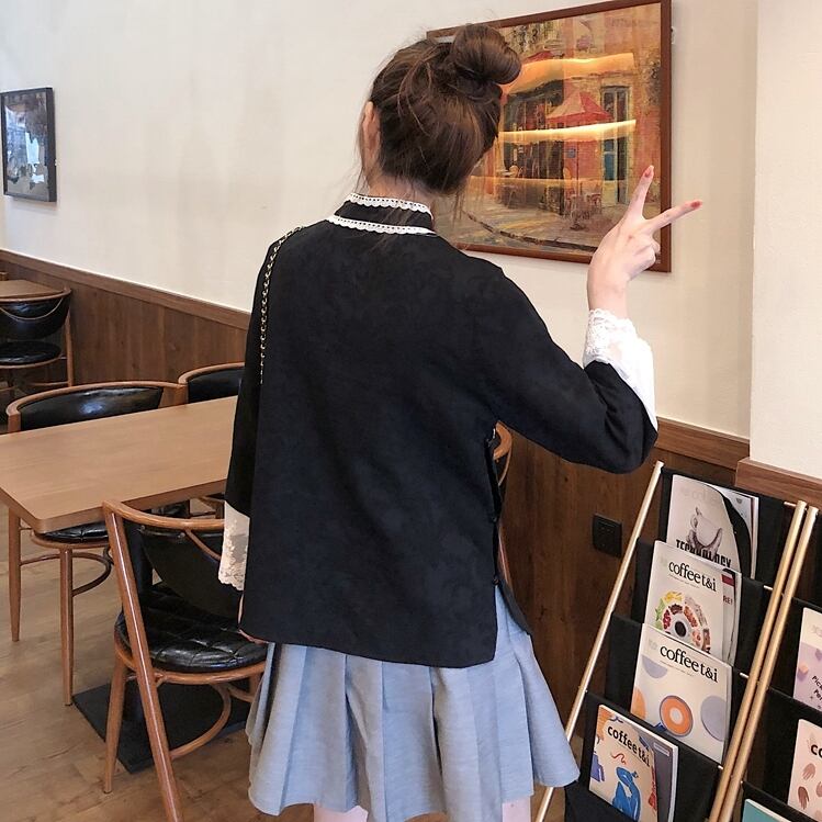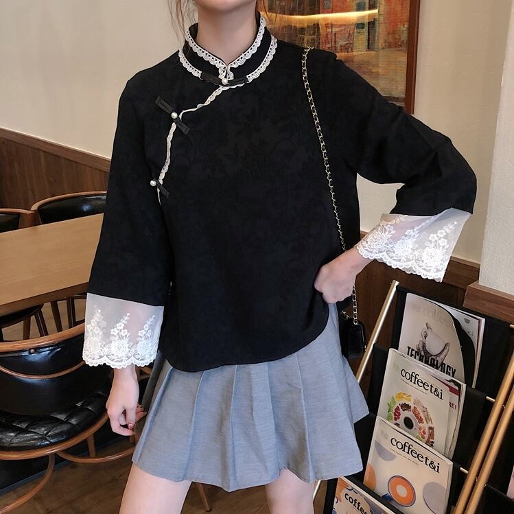 スタイルスタンダードシャツ レディーススプリングオータムブラックボタンレースショートトップス ロング レトロ 春物 秋物 萌量不足51673595652