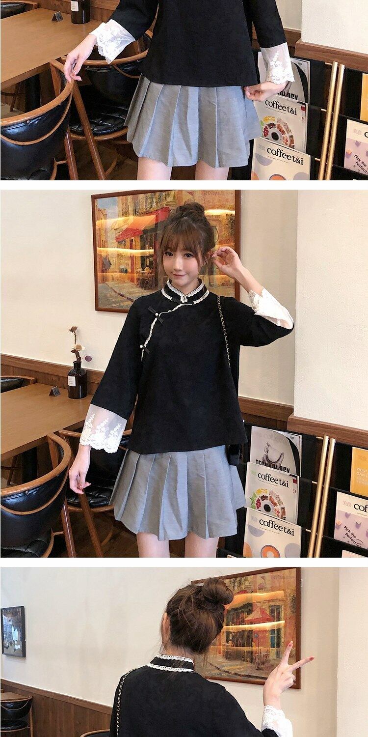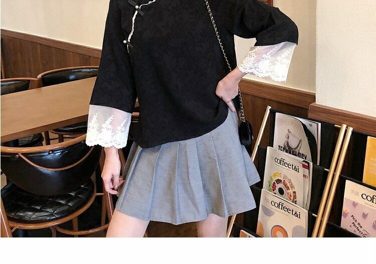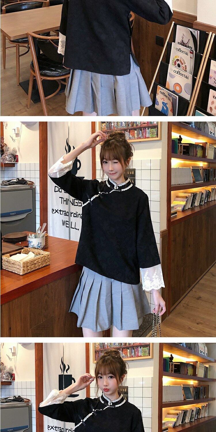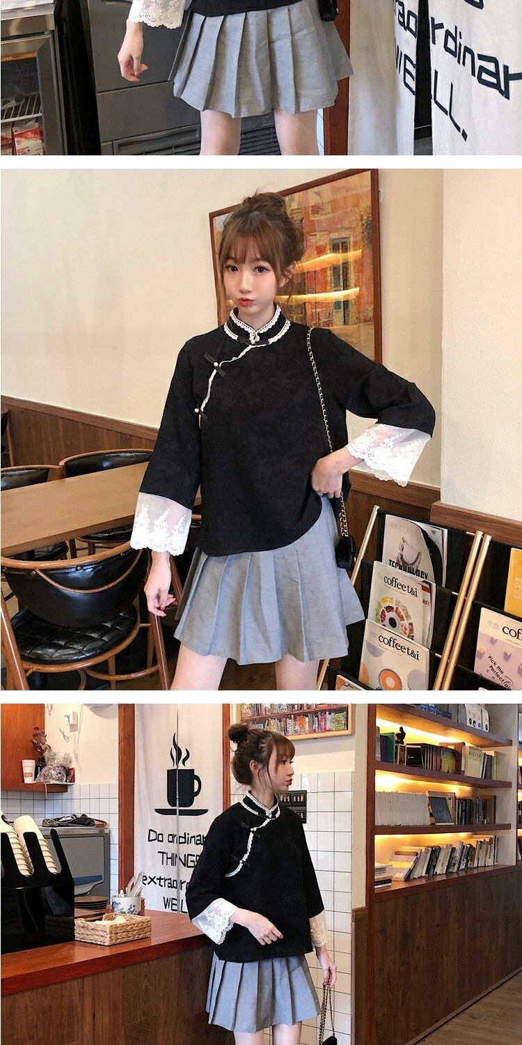 スタイルスタンダードシャツ レディーススプリングオータムブラックボタンレースショートトップス ロング レトロ 春物 秋物 萌量不足51673595652
