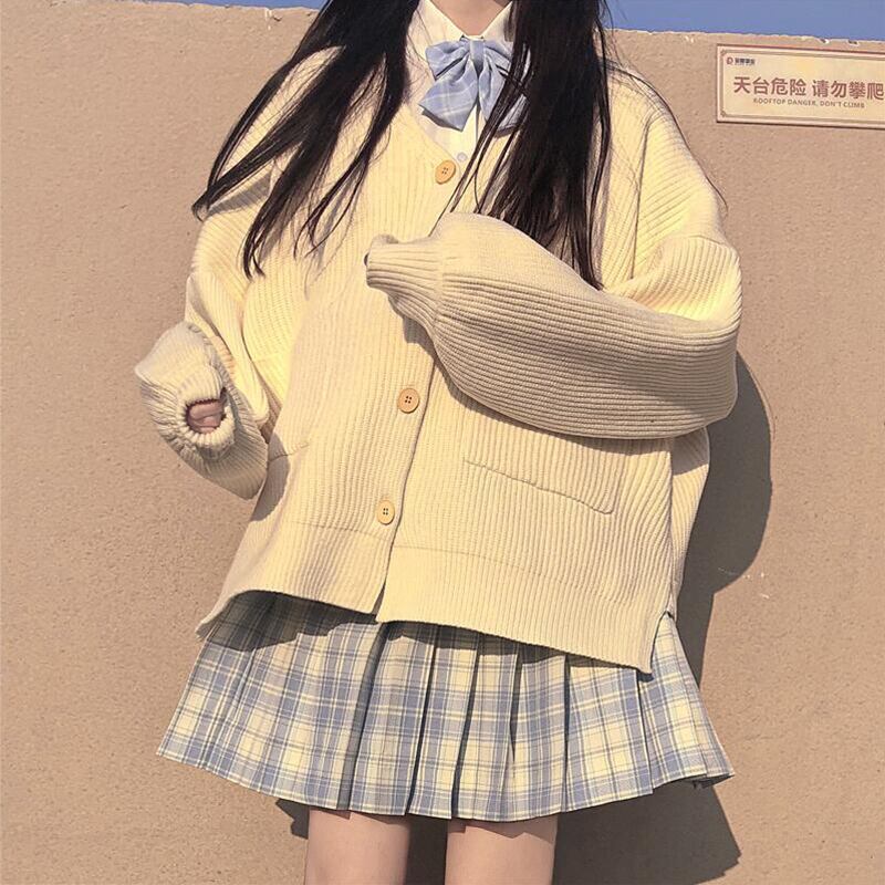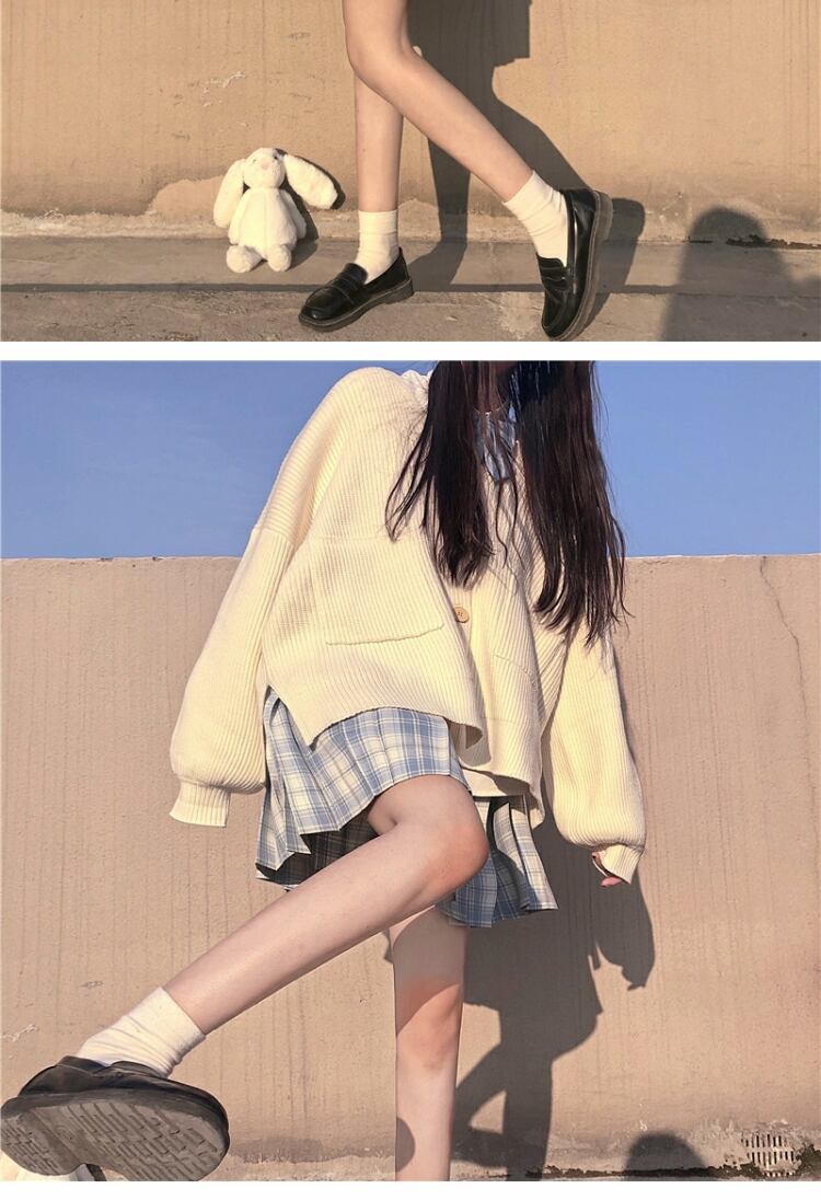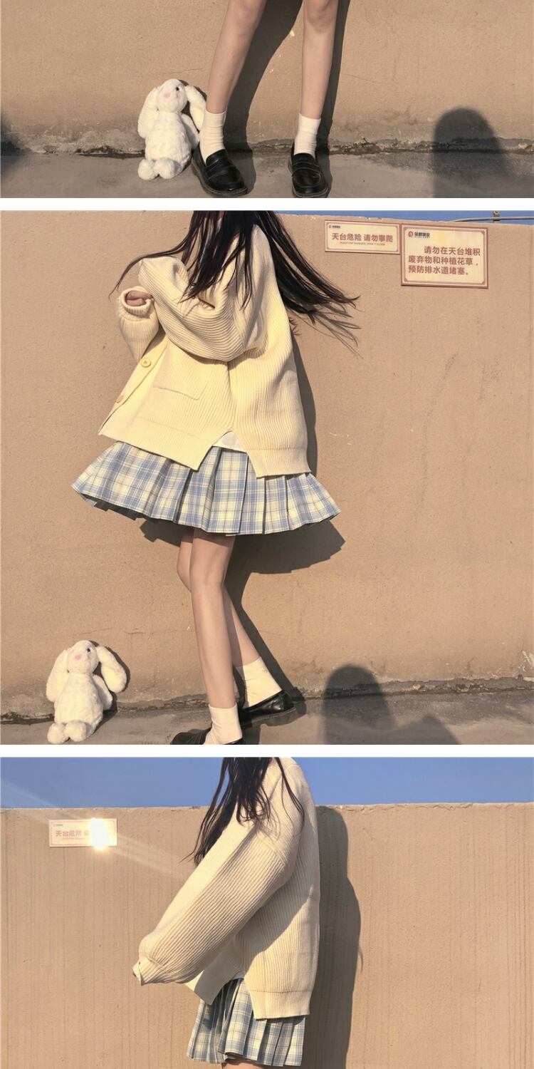 色:オフホワイトのセーター(シングルピース),白いシャツ(シングルピース),青い格子縞のスカート(シングルピース)
