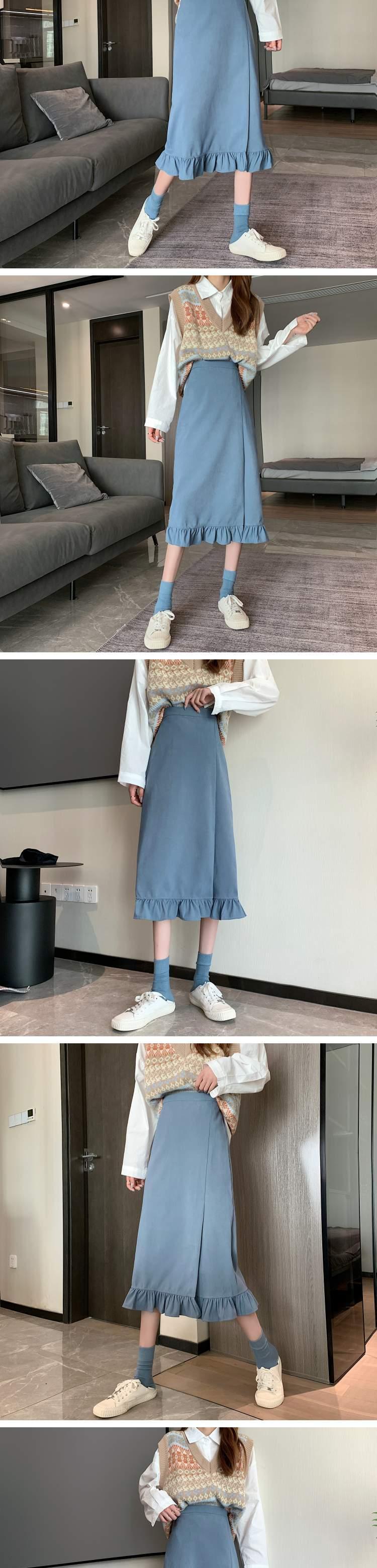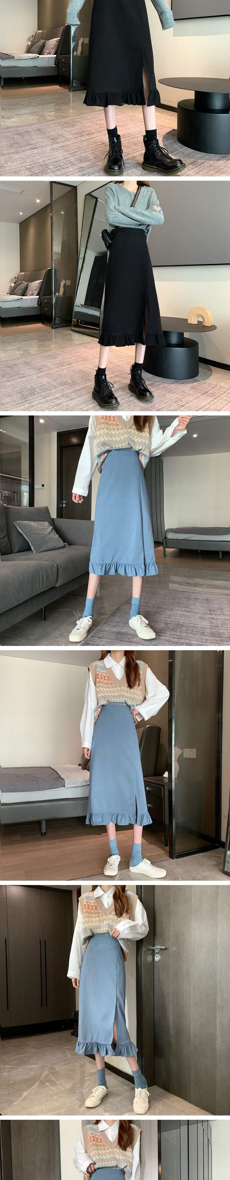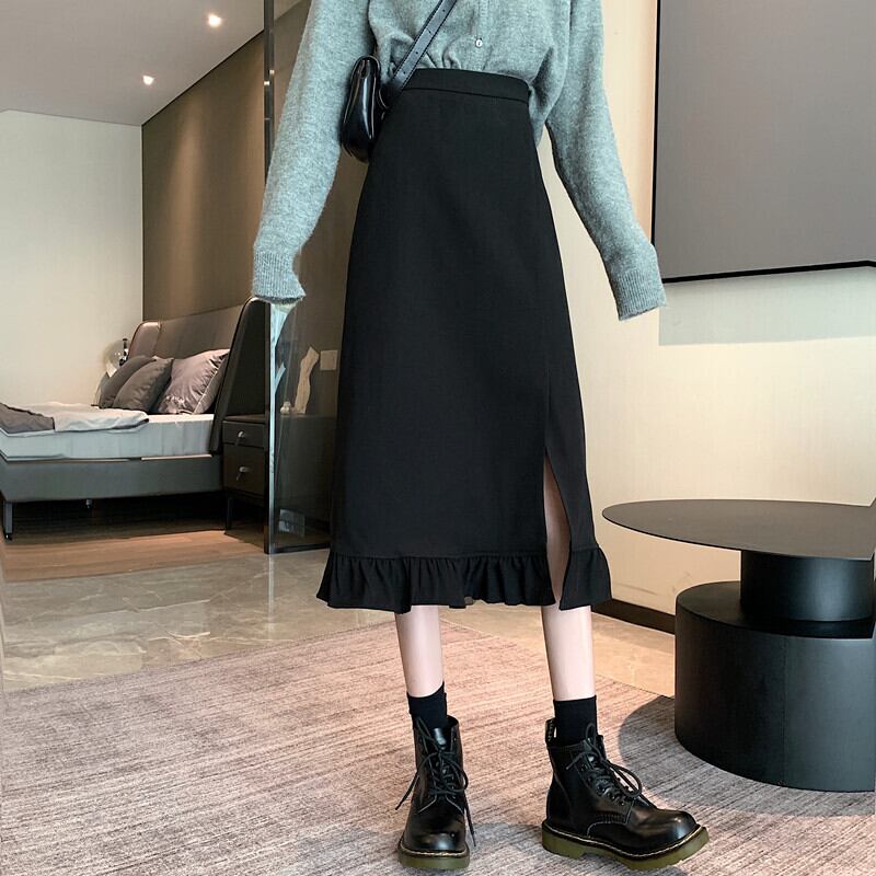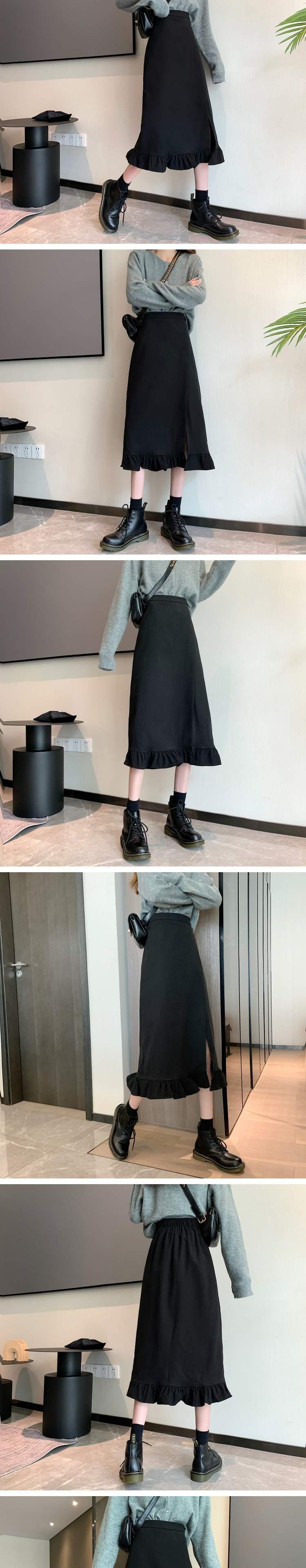 ラッフルスカート ブラックハイウェストウェストAラインロング 萌量不足76031952718