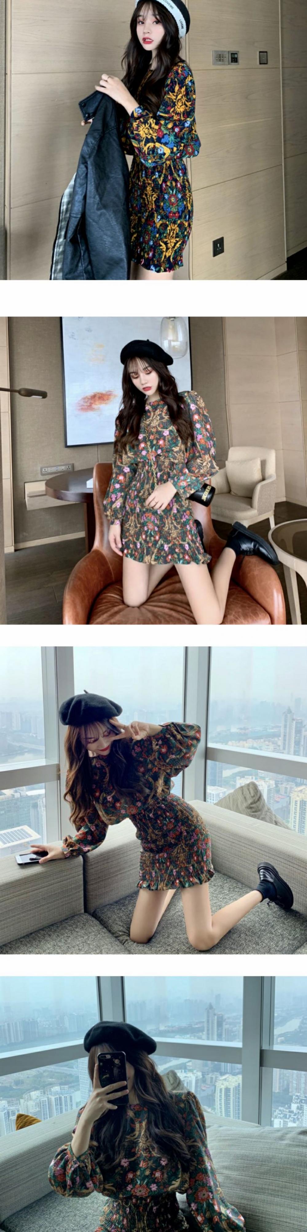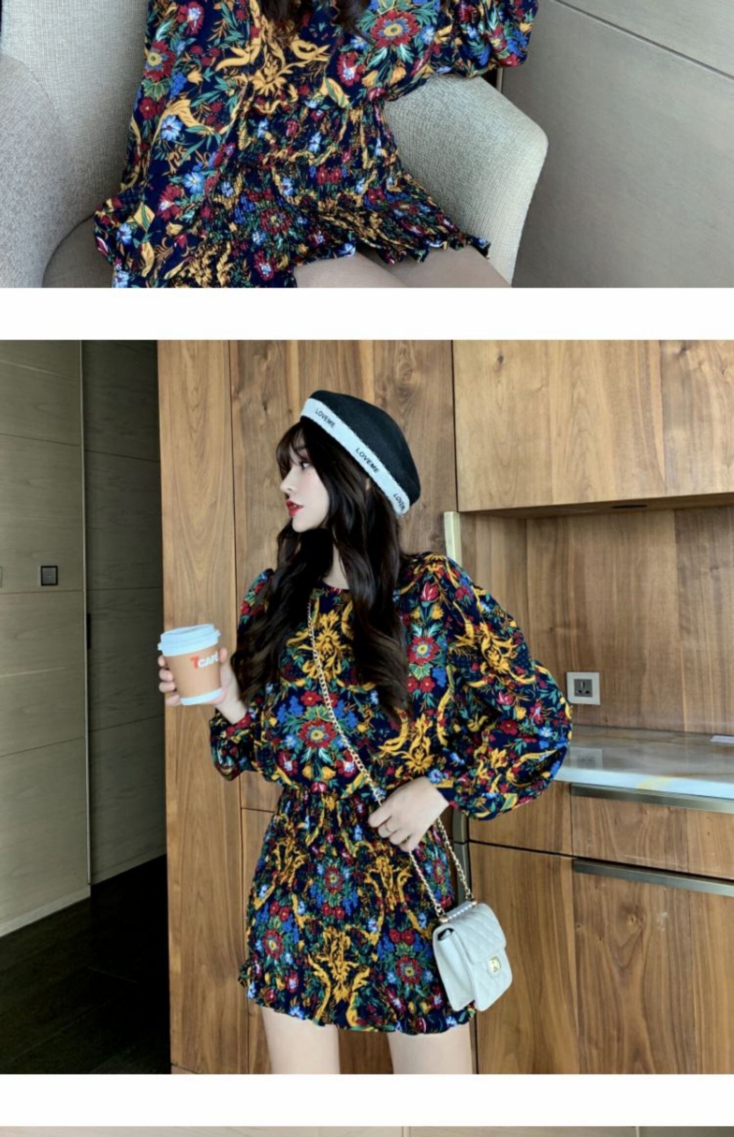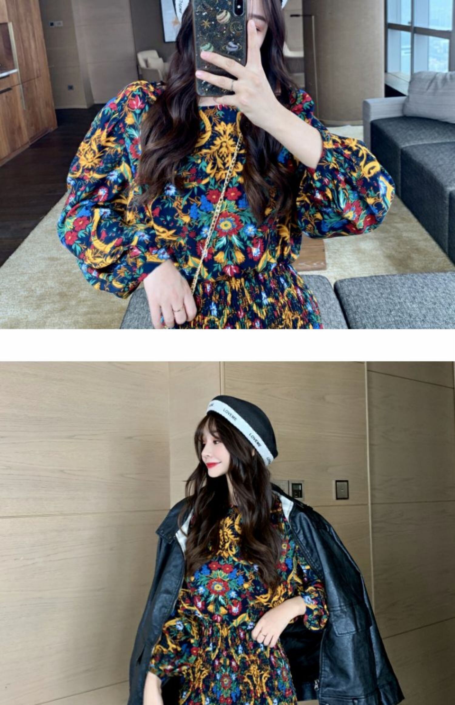 スリーブスプリングオータムフローラルスリムウェストドレス スタンダードハイウェストスカート ランタンスリーブ レトロ 春物 秋物 花柄 萌量不足78847201856