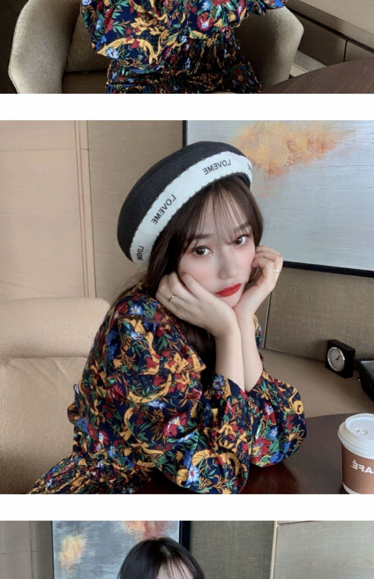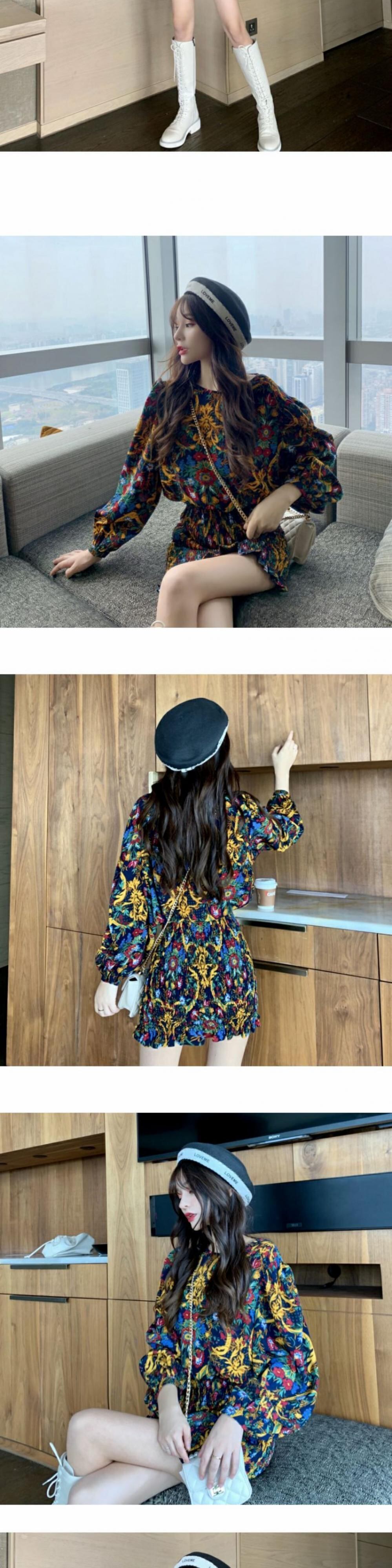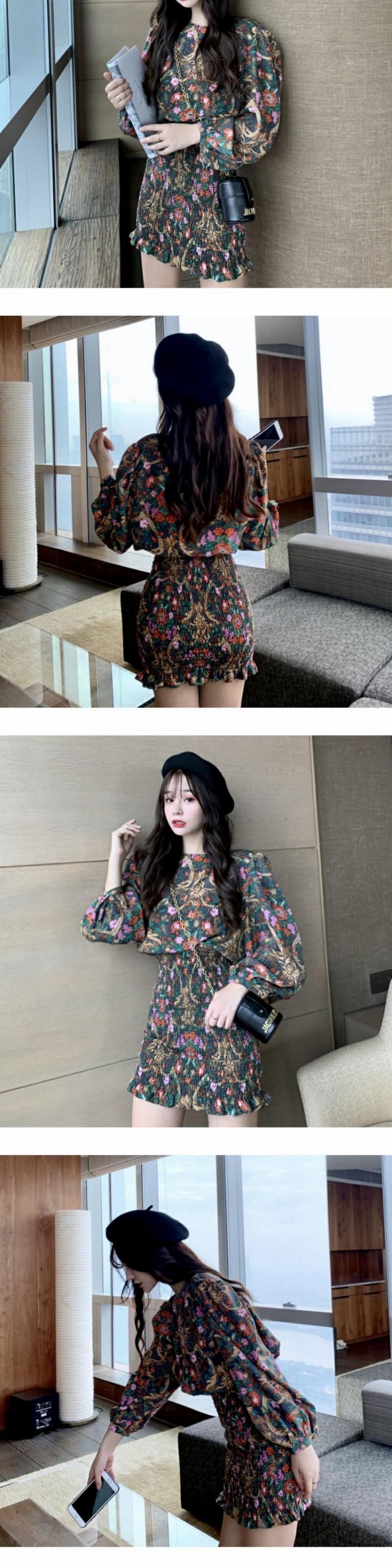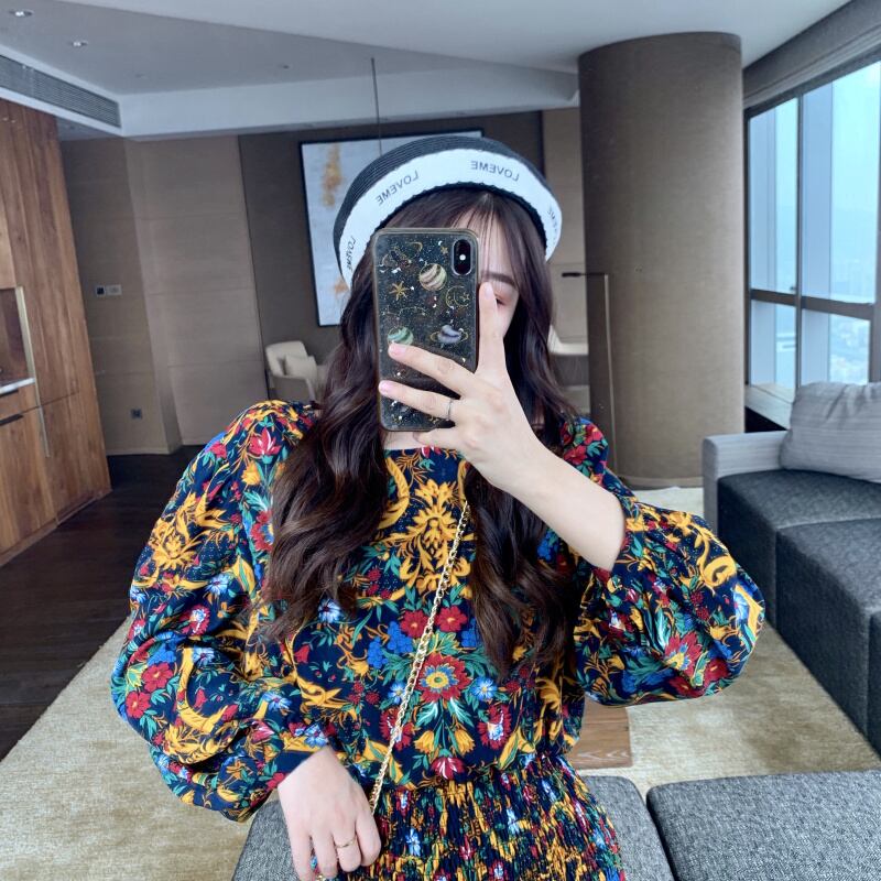 スリーブスプリングオータムフローラルスリムウェストドレス スタンダードハイウェストスカート ランタンスリーブ レトロ 春物 秋物 花柄 萌量不足78847201856