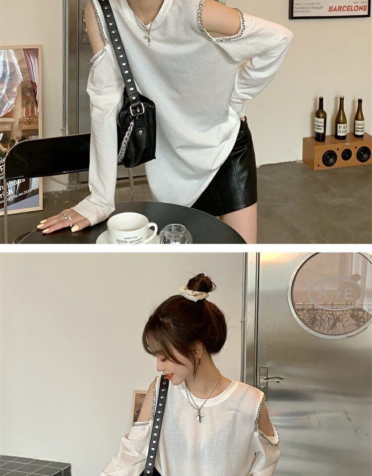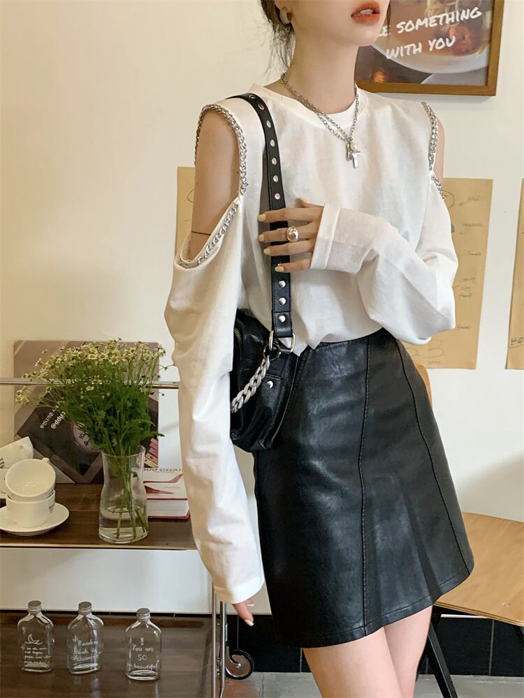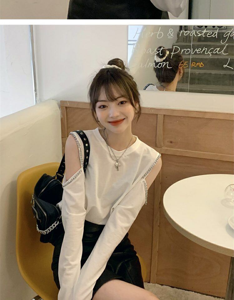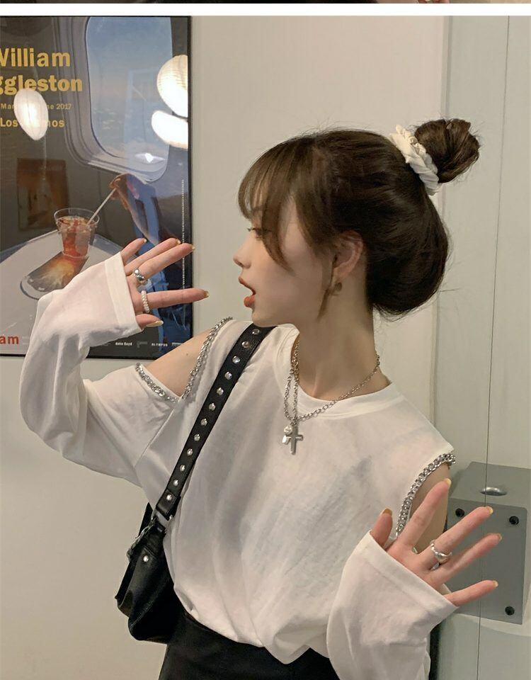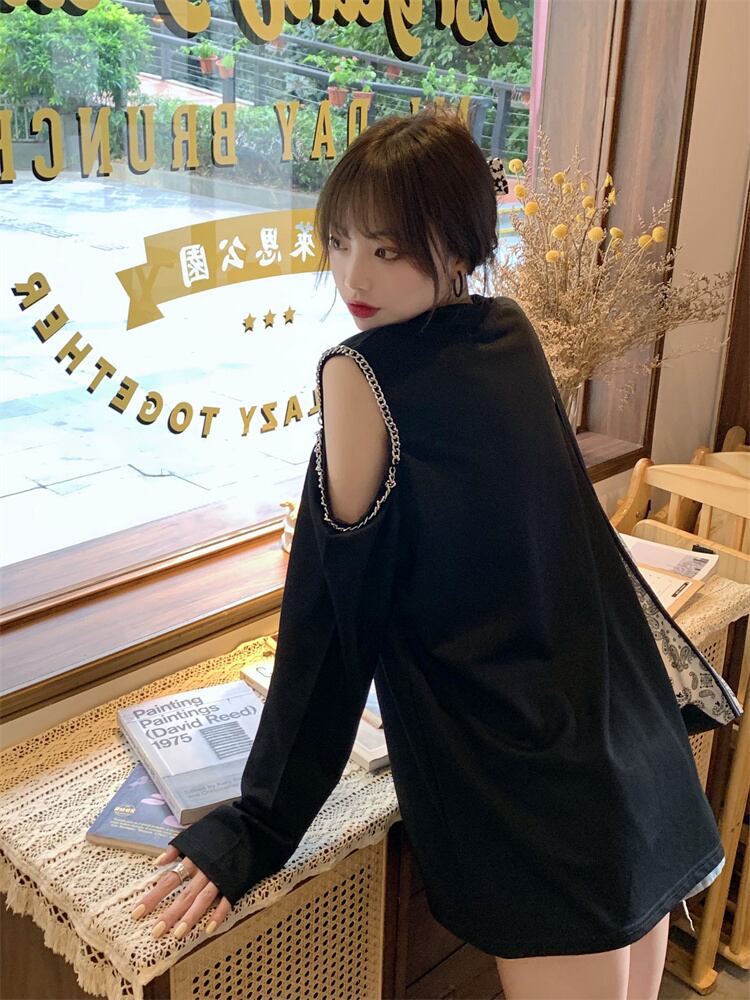 ストラップレスTシャツ スプリングオータム薄手ルーズホワイトトップス ロング 春物 秋物 萌量不足9677876809