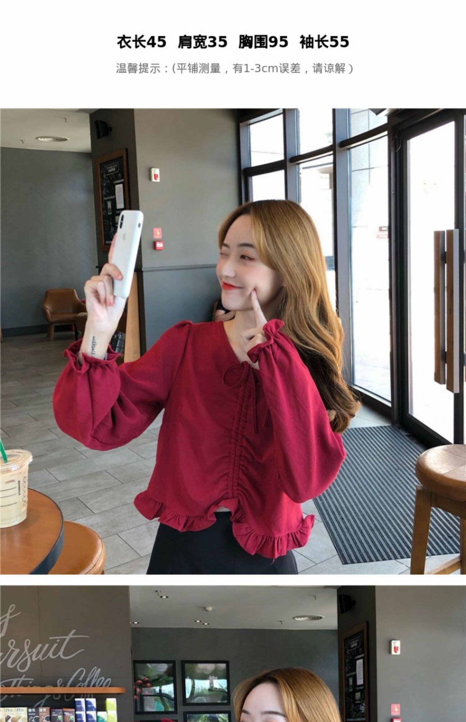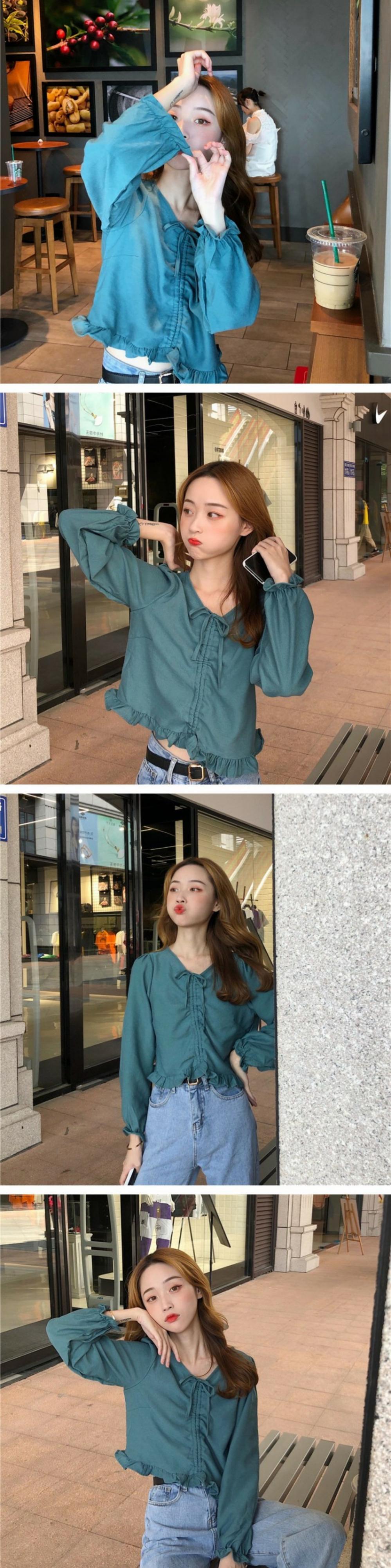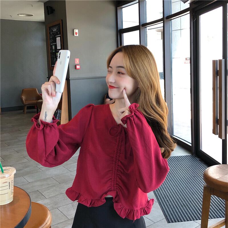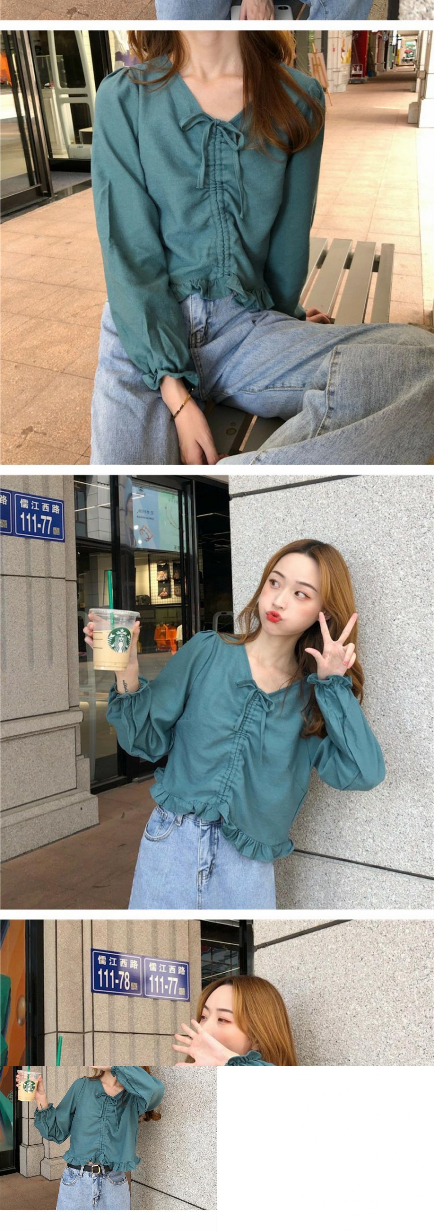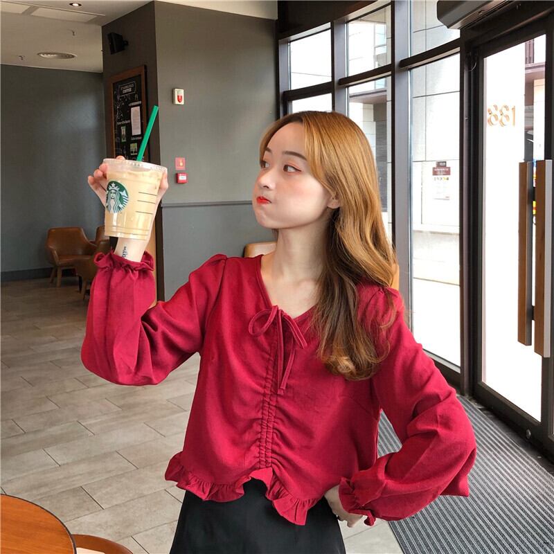 オータムVネックシャツ スタイルギャザーショートスリーブトップス 大人ガーリー スウィート キュート カジュアル 秋物 萌量不足38426773347