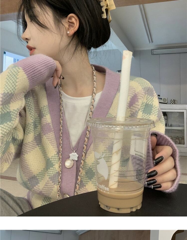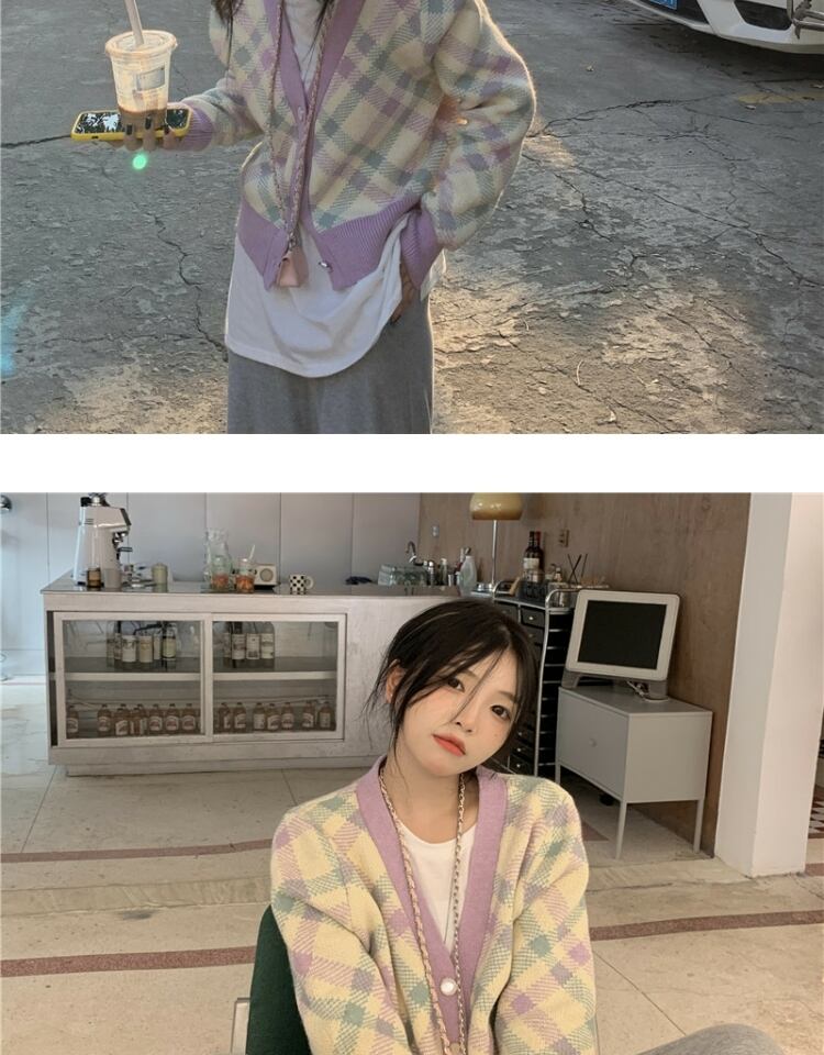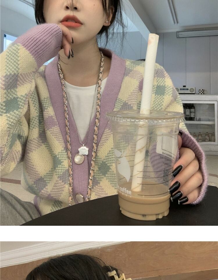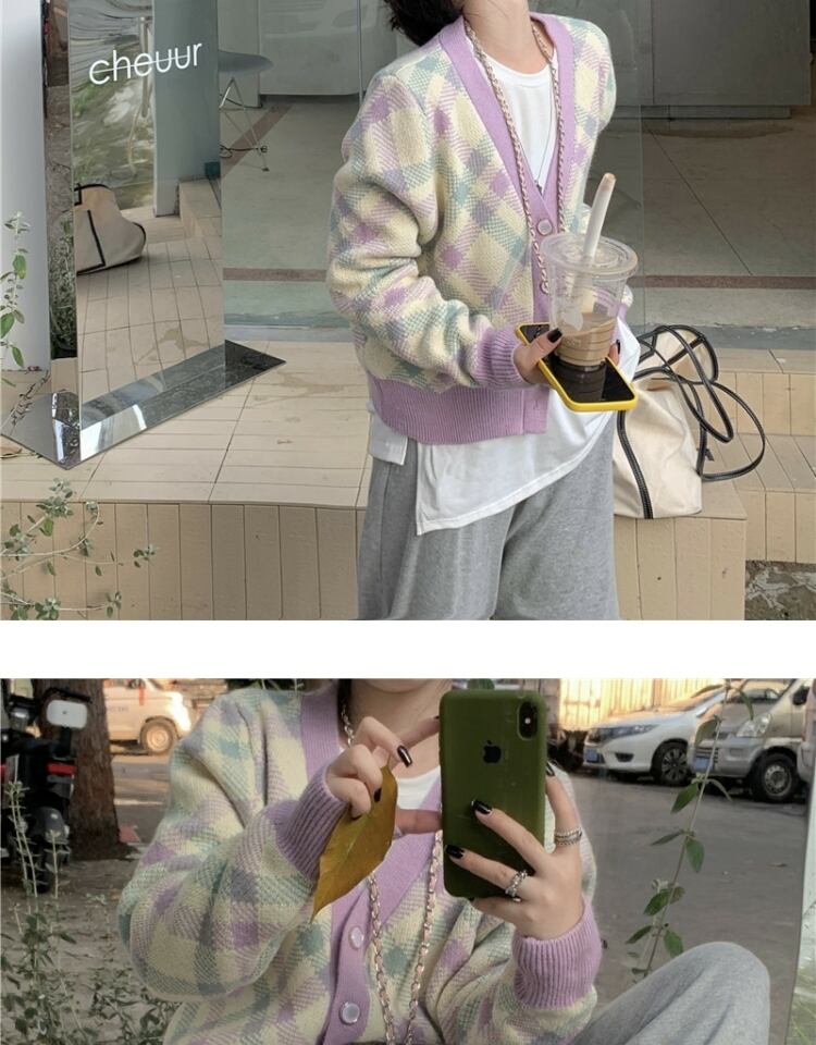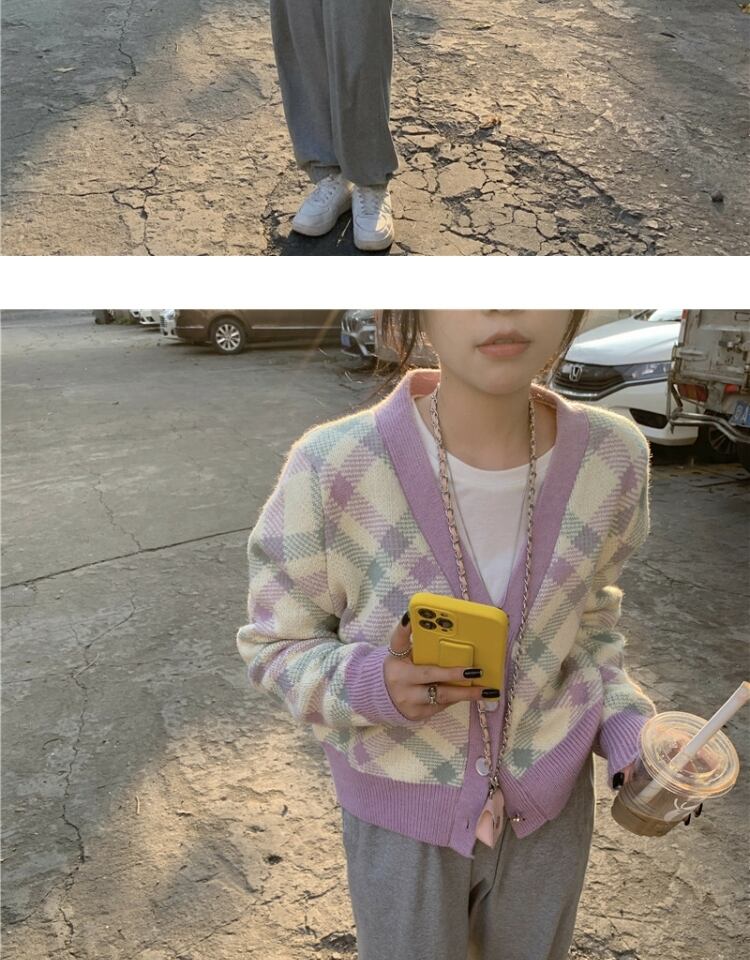 格子柄セーター オータムウィンタークロップドトップス ルーズニットカーディガンジャケット 秋物 冬物 パープル 萌量不足1308220353