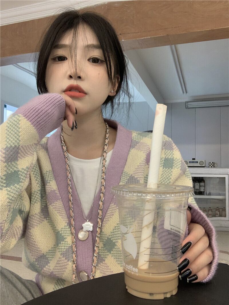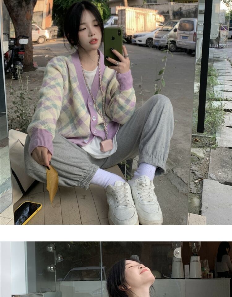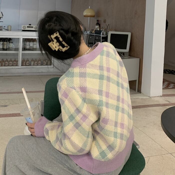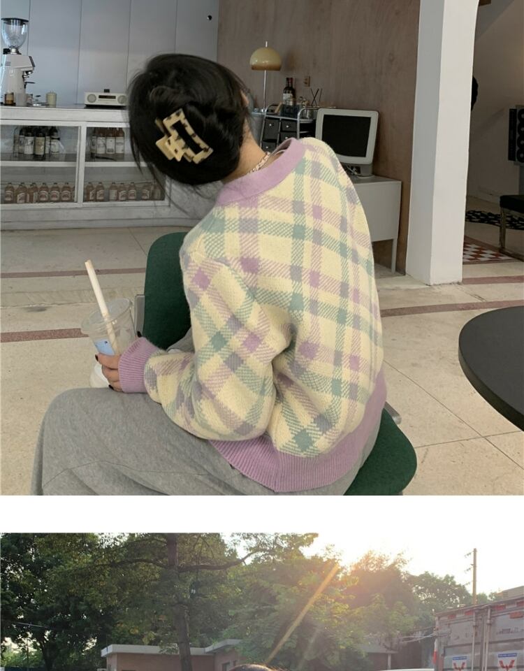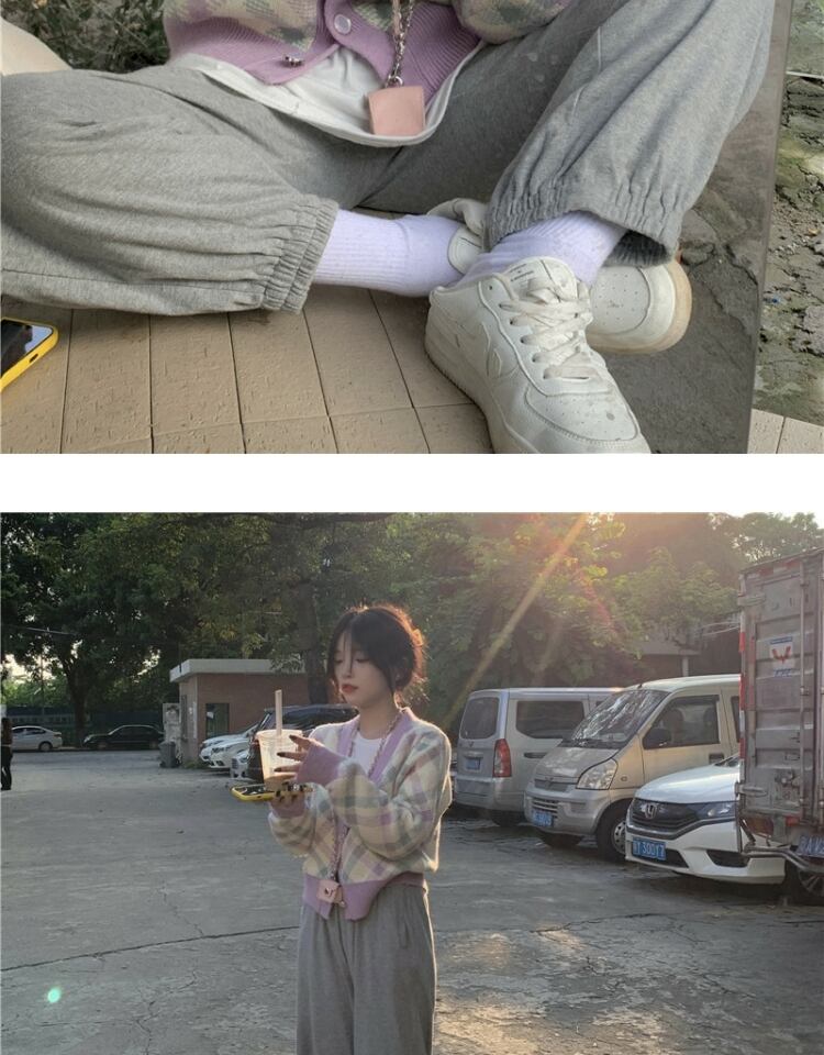 格子柄セーター オータムウィンタークロップドトップス ルーズニットカーディガンジャケット 秋物 冬物 パープル 萌量不足1308220353