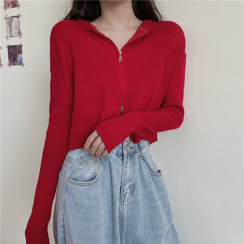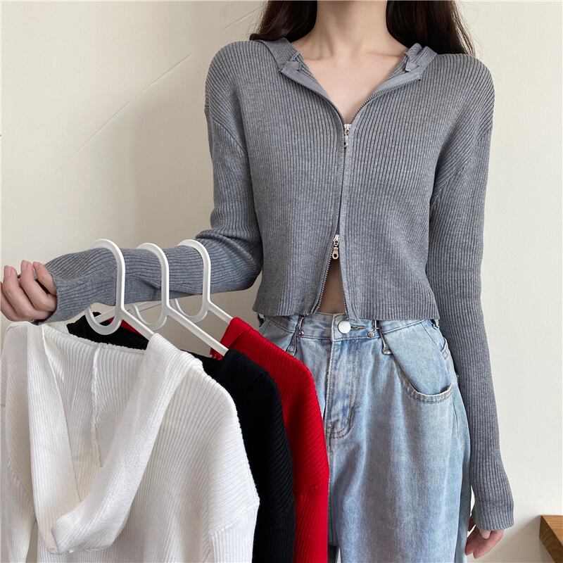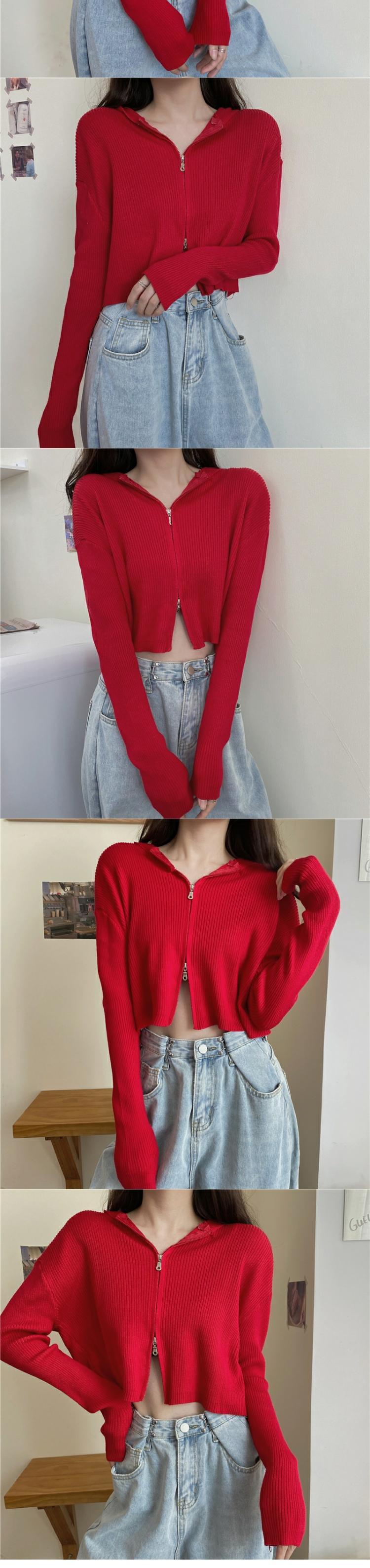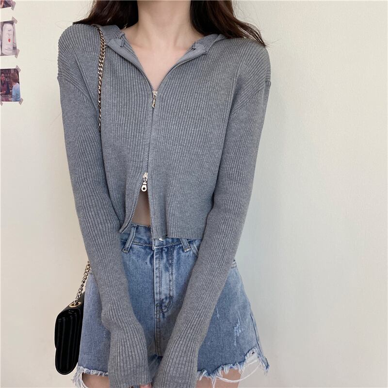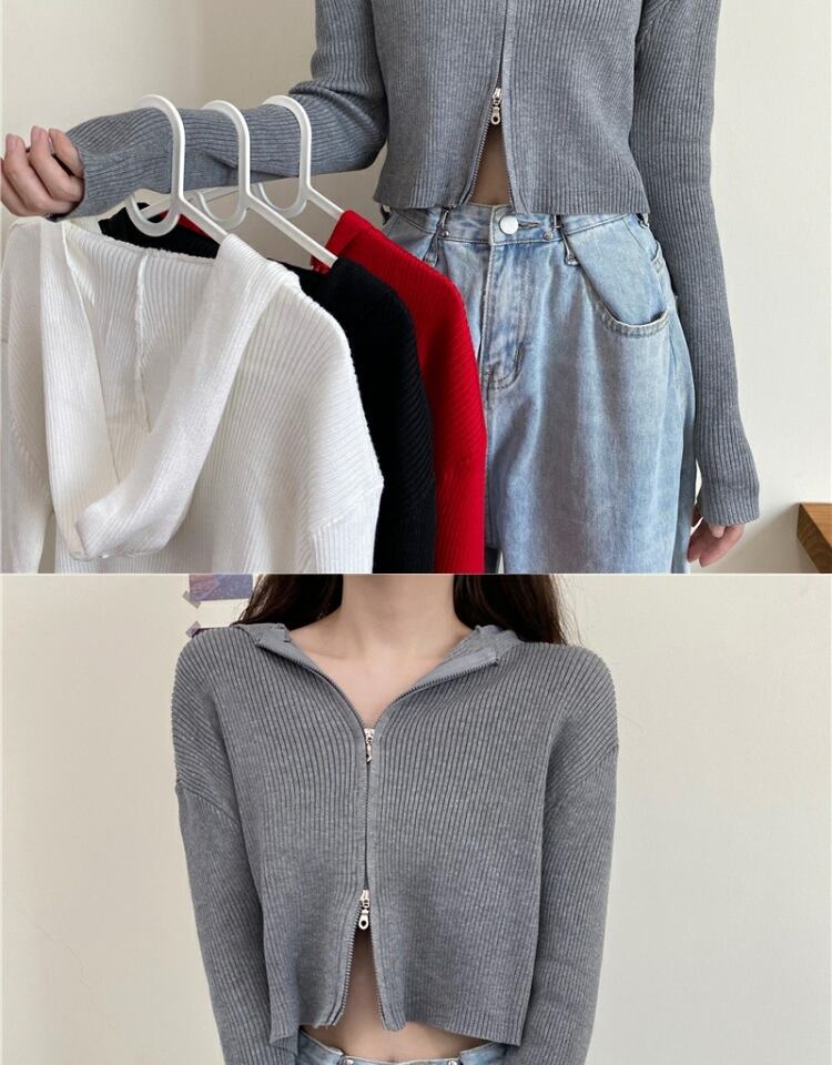 ジッパーフードニットカーディガンスプリングオータムスリムショートジャケット トップス 春物 秋物 萌量不足80261421254