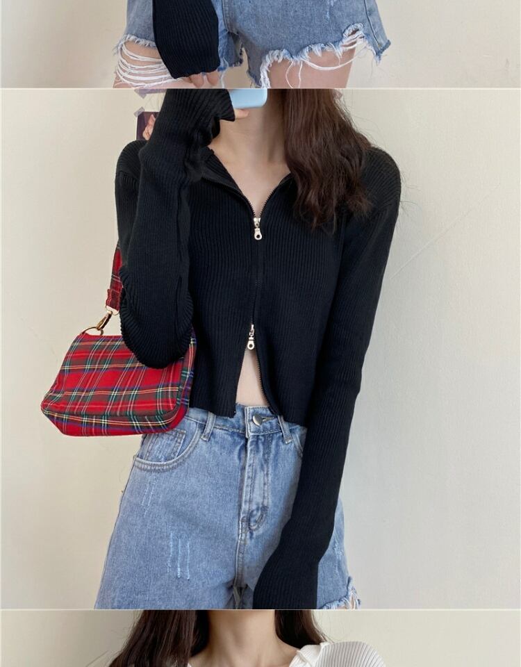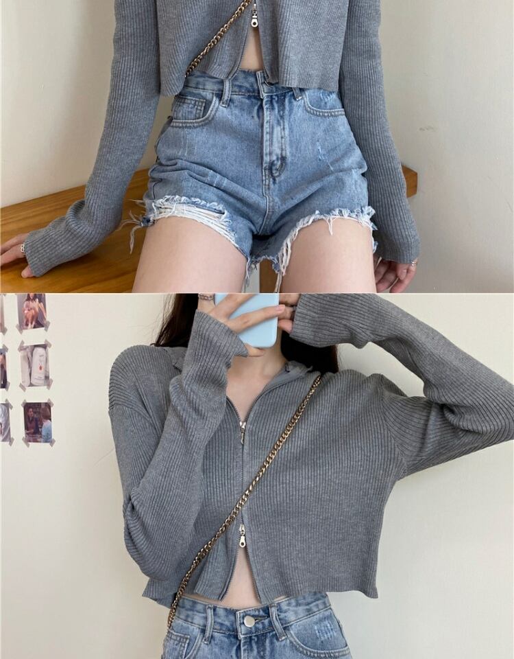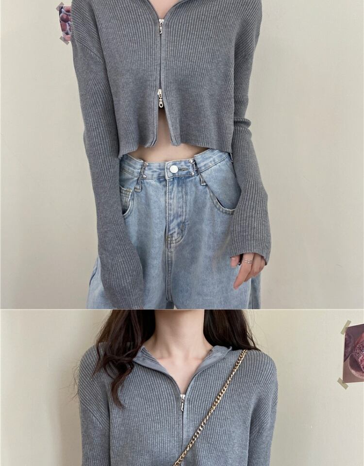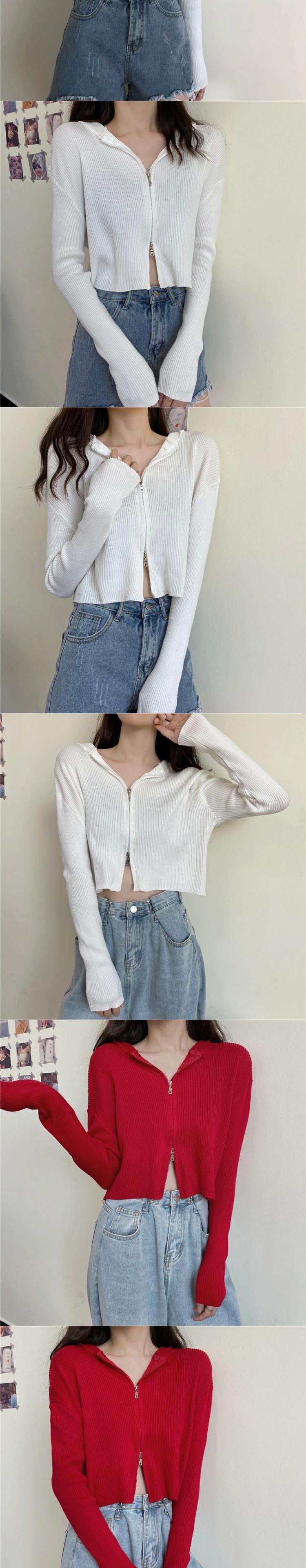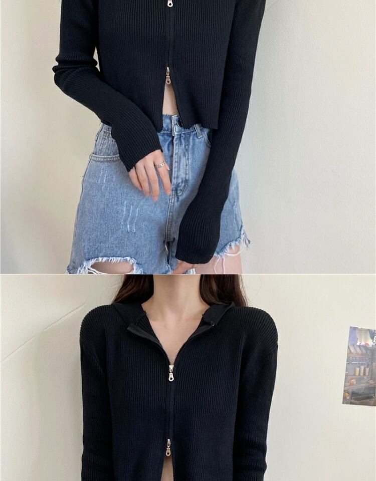 ジッパーフードニットカーディガンスプリングオータムスリムショートジャケット トップス 春物 秋物 萌量不足80261421254
