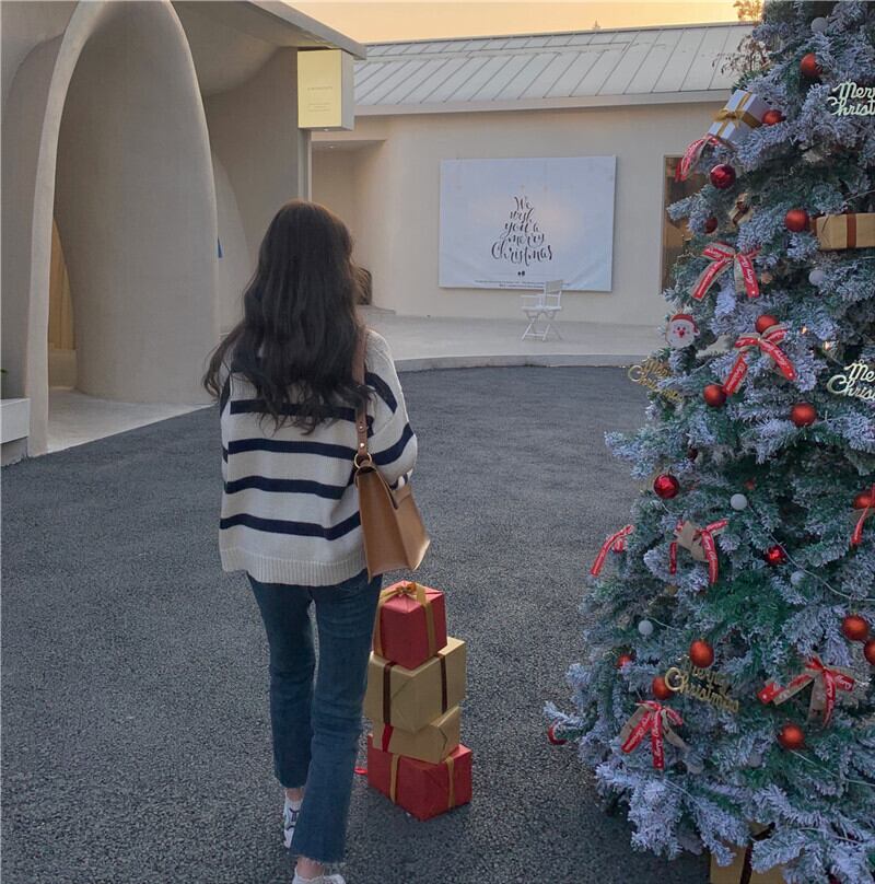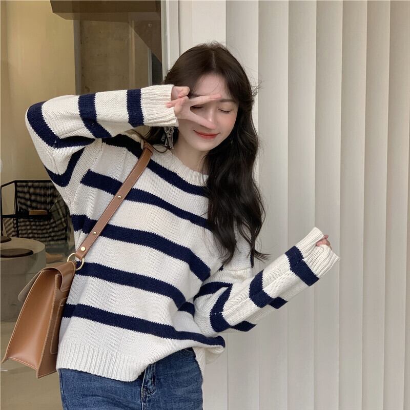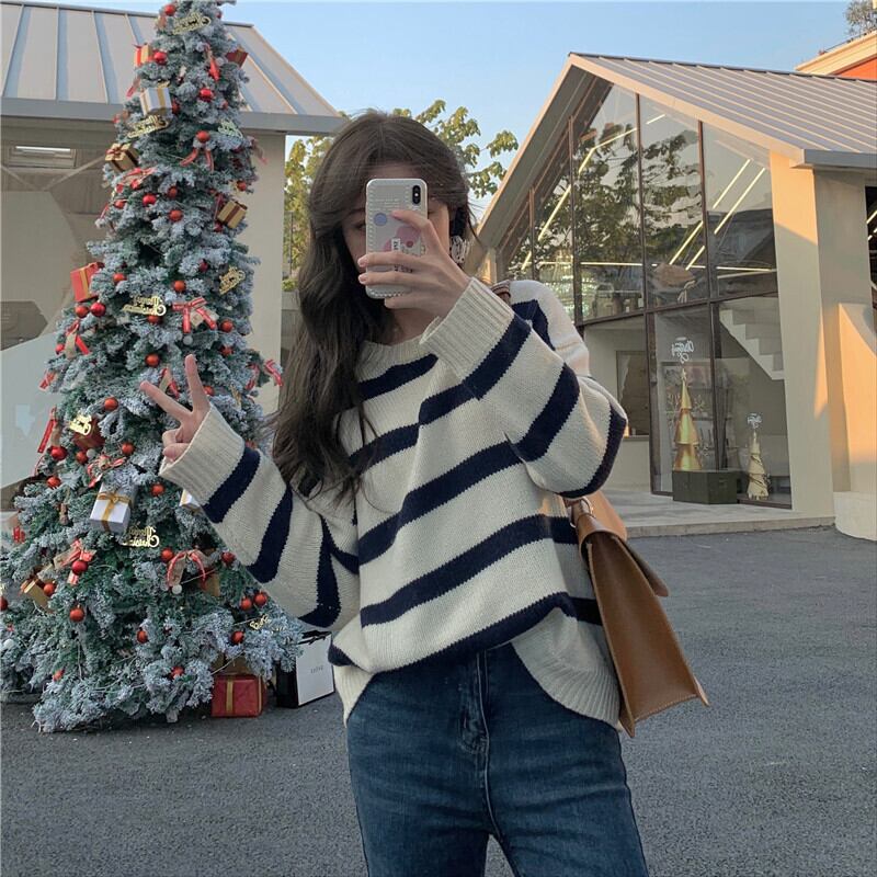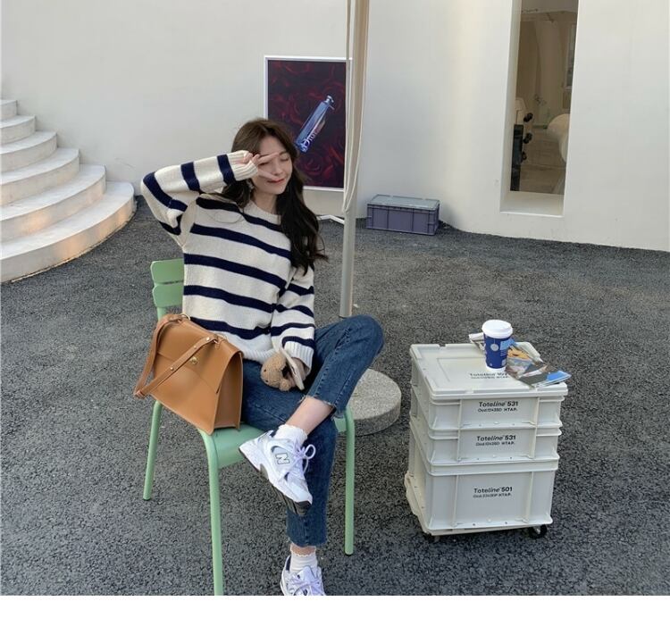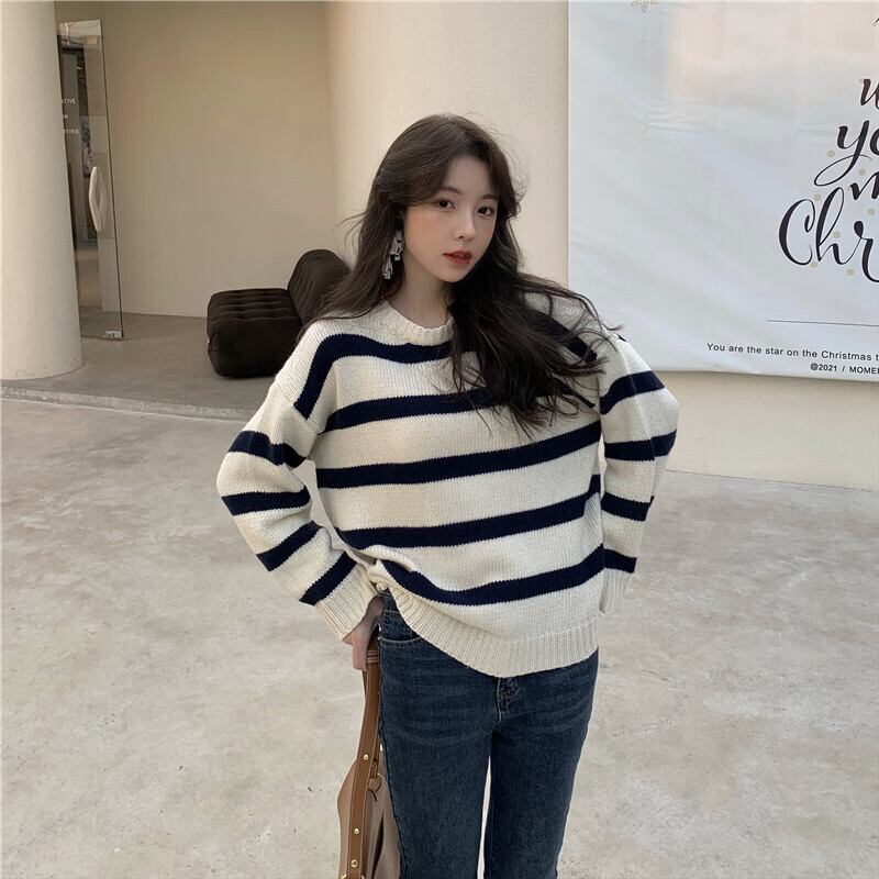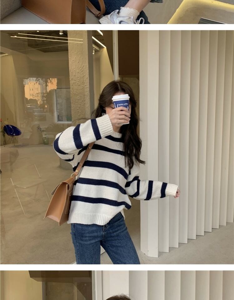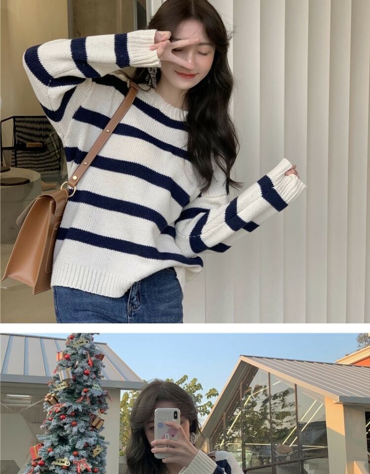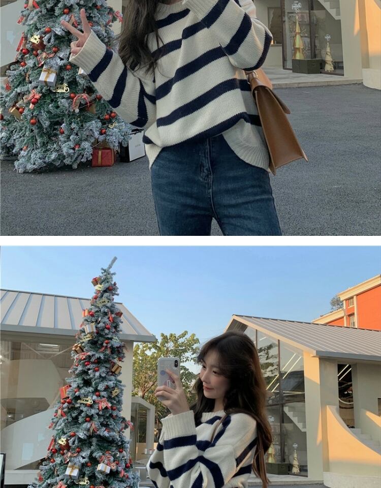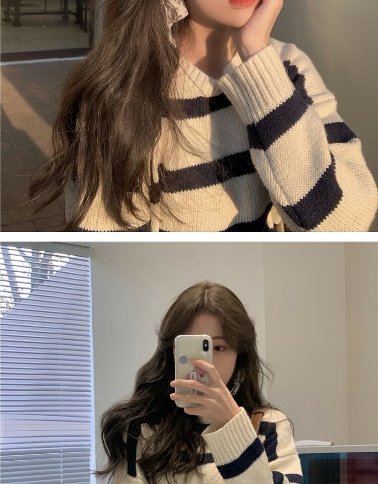 ラウンドネックプルオーバー ストライプセーター オータムウィンターニットシャツ 秋物 冬物 Oネック 萌量不足70069664717