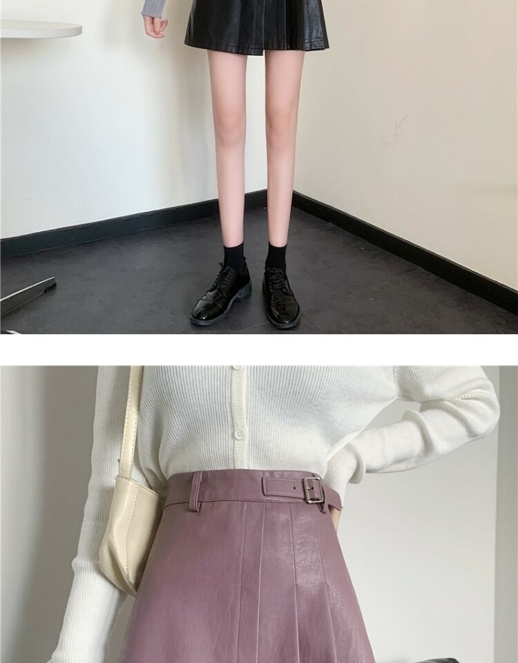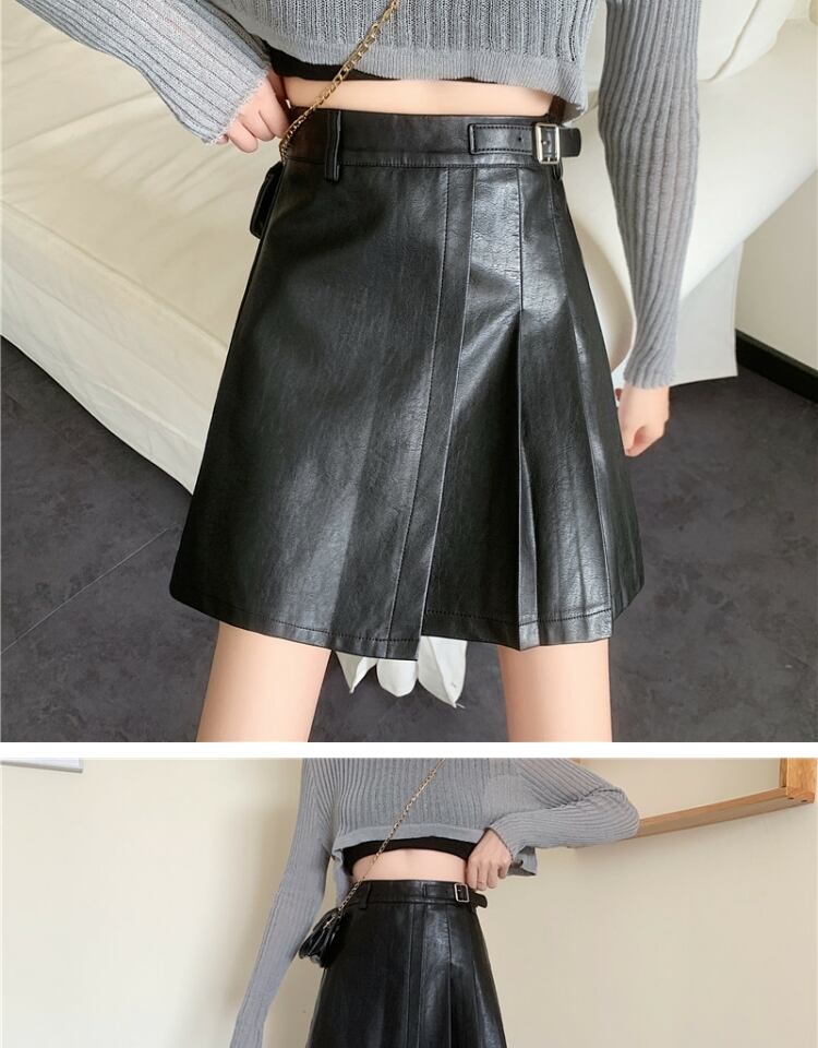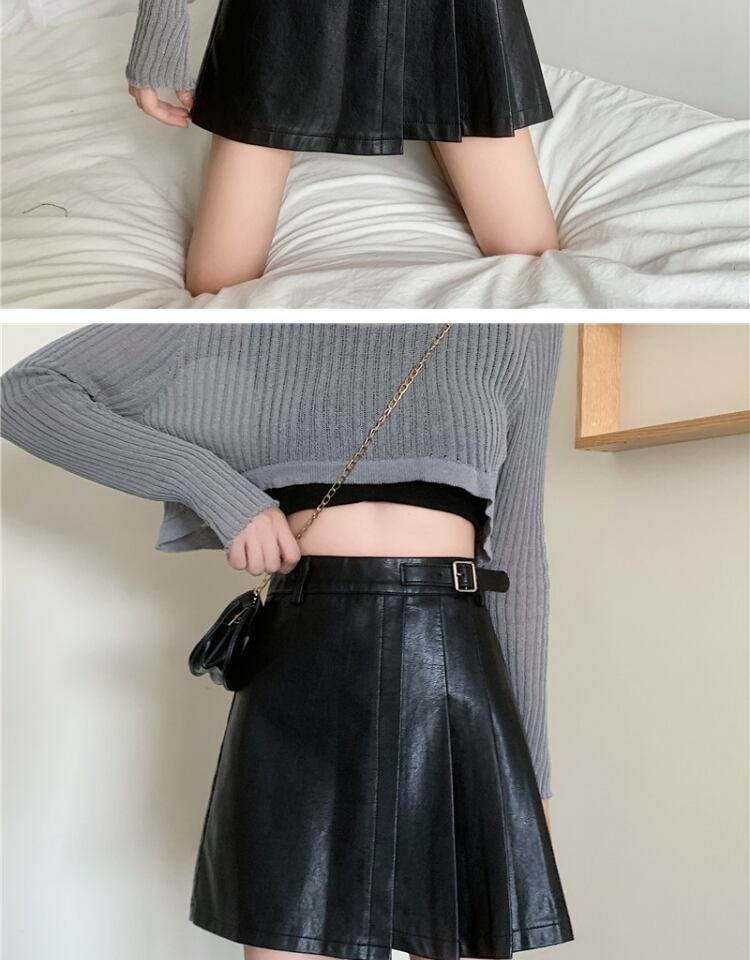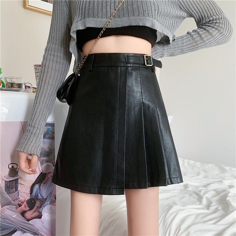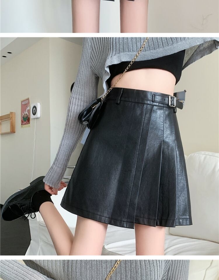 プリーツスカート スプリングオータムレザーハイウェストウェスト薄手Aラインショート 春物 秋物 萌量不足92838508884