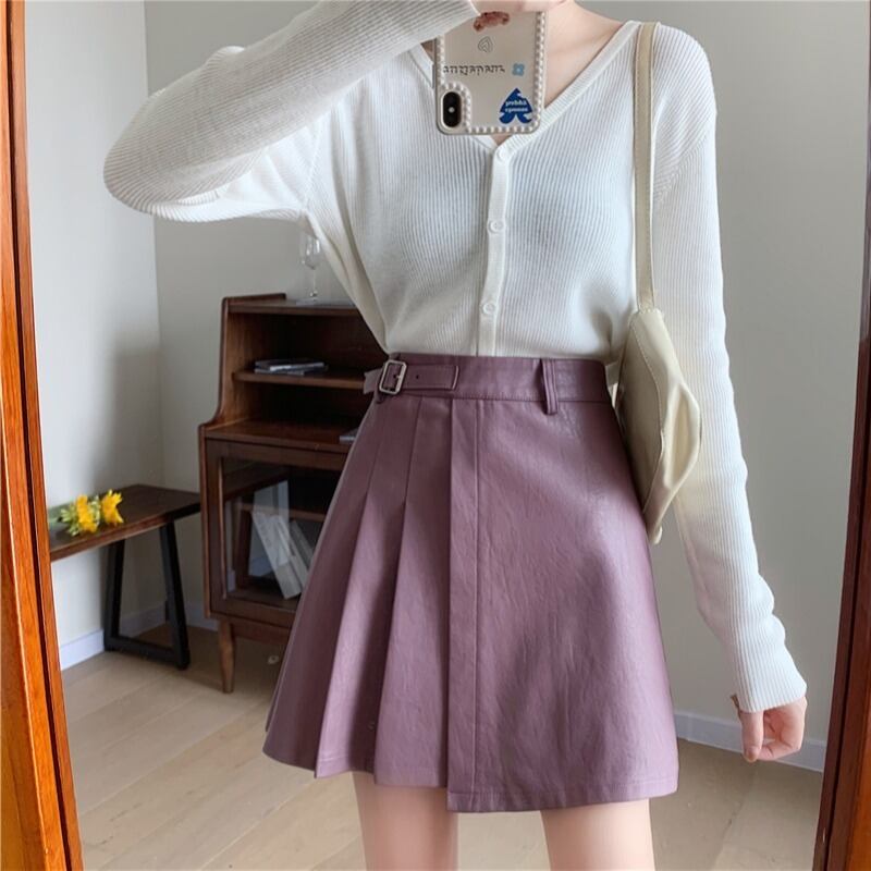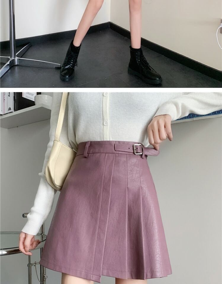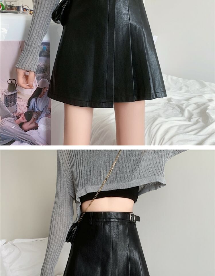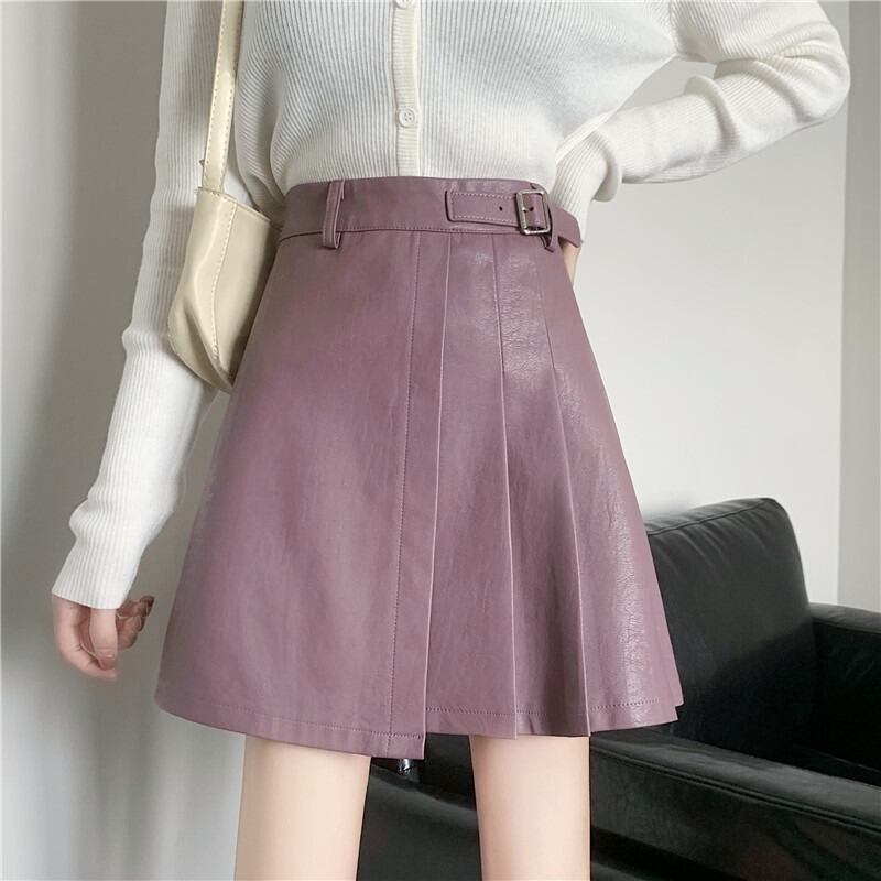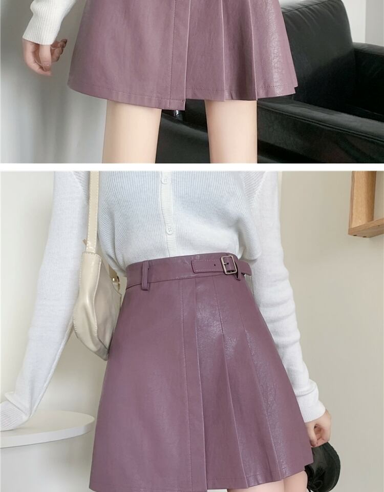 プリーツスカート スプリングオータムレザーハイウェストウェスト薄手Aラインショート 春物 秋物 萌量不足92838508884