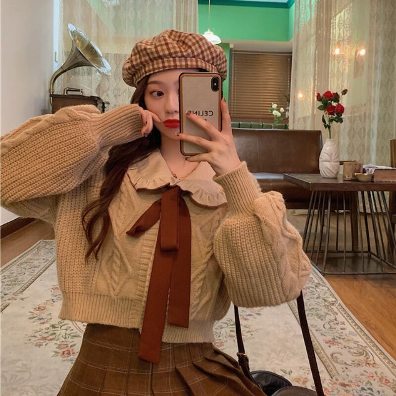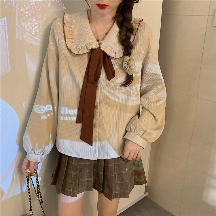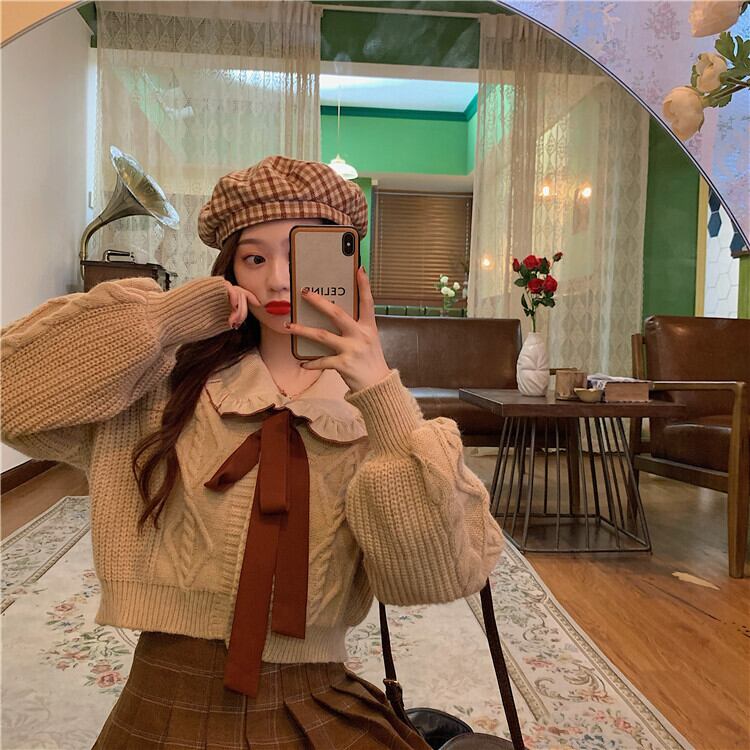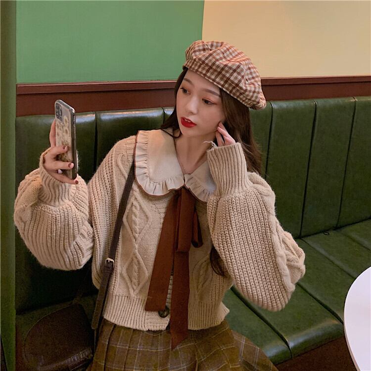 色:アプリコットシャツ,コーヒースカート,カーキ色のセーター
