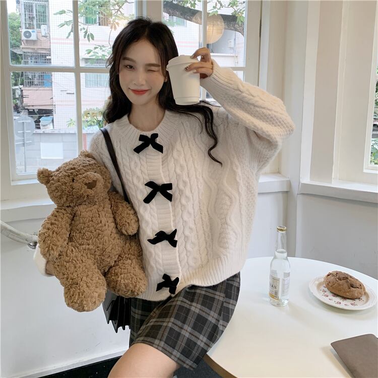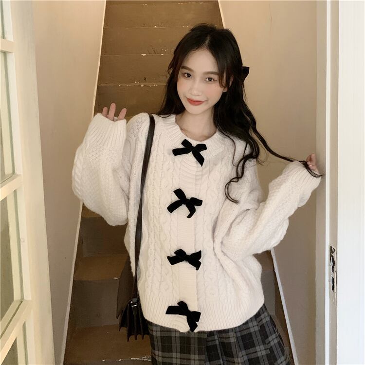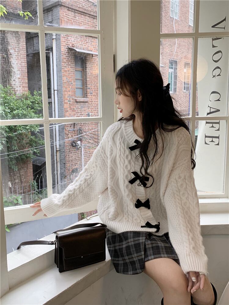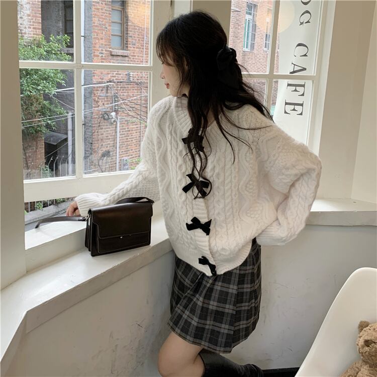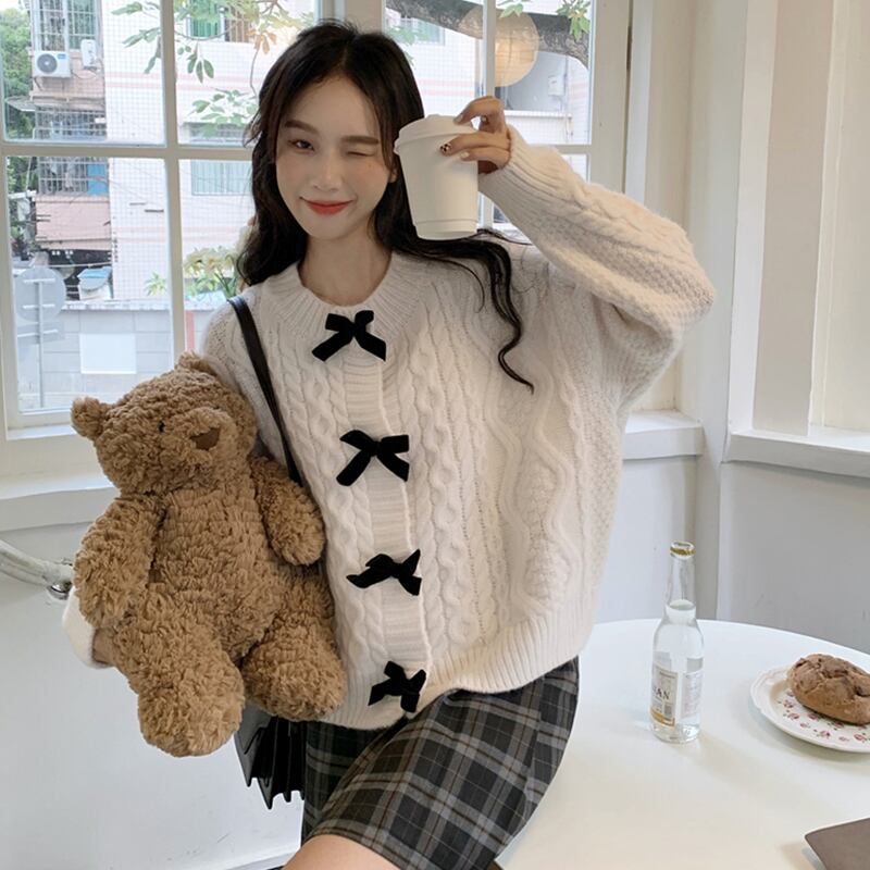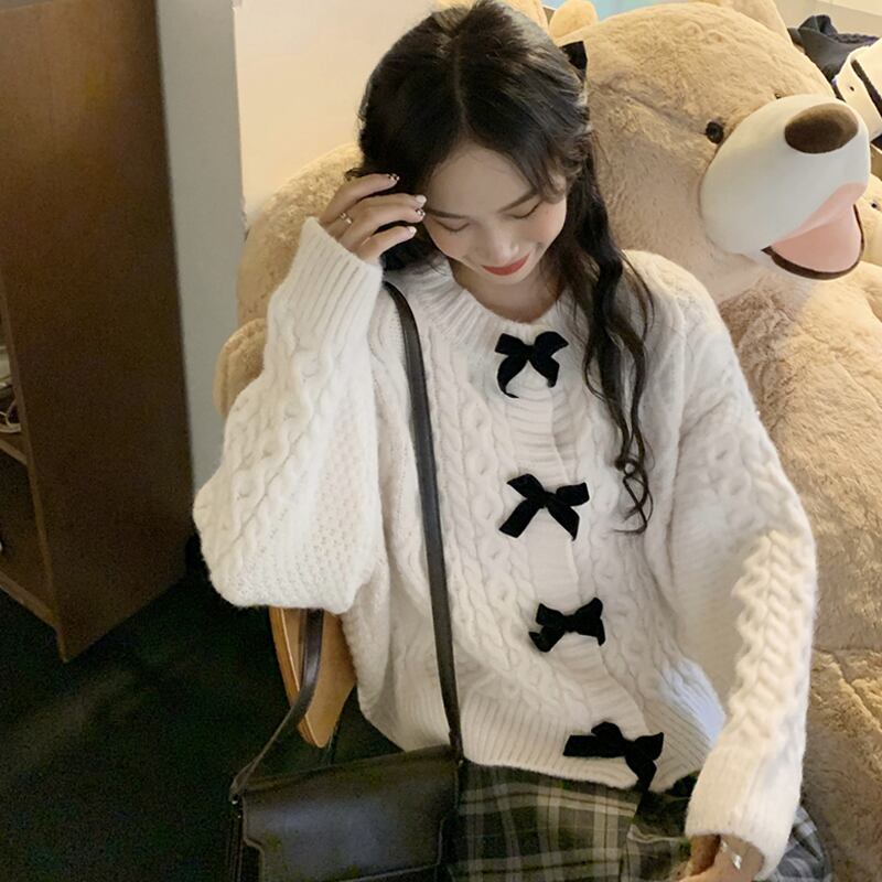 セーター ジャケット オータムウィンタースタンダードニットカーディガン ホワイト リボン レトロ 秋物 冬物 萌量不足95084629258