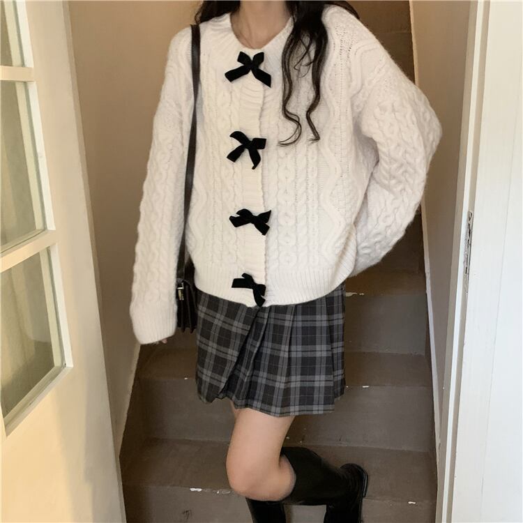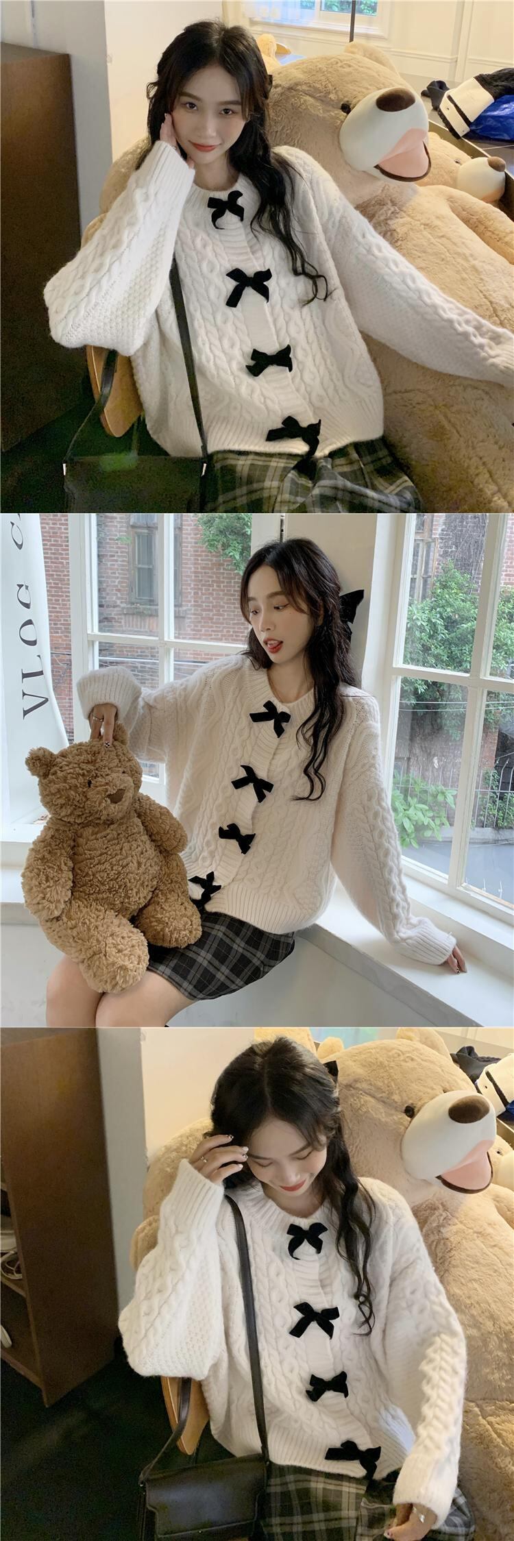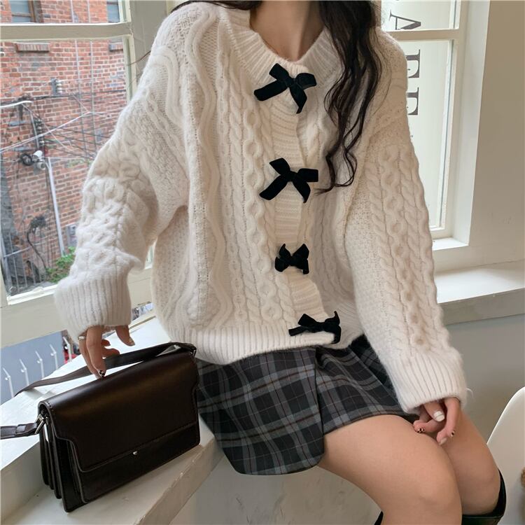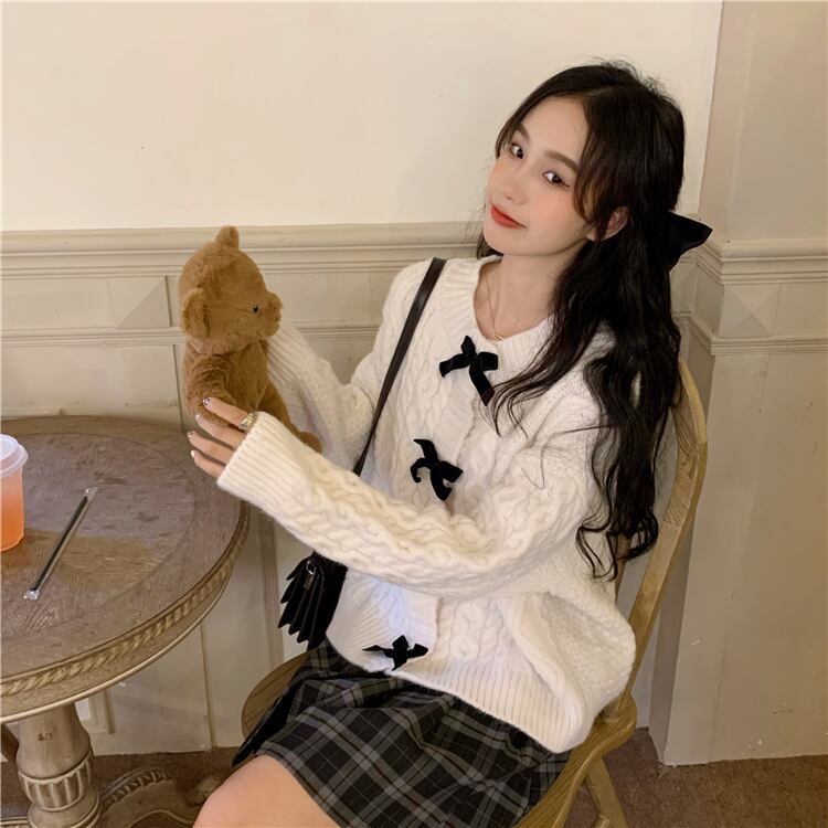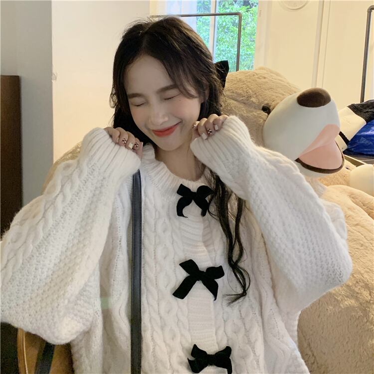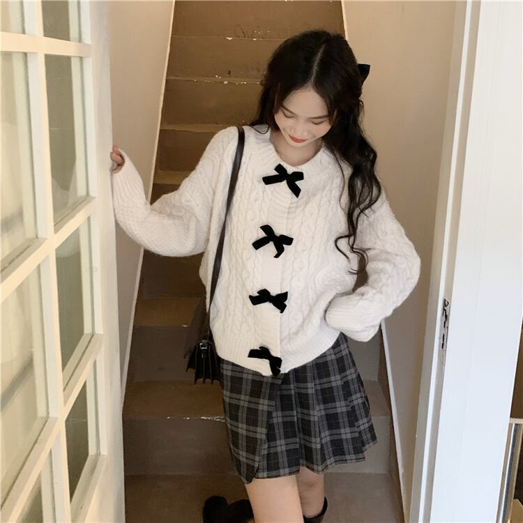 セーター ジャケット オータムウィンタースタンダードニットカーディガン ホワイト リボン レトロ 秋物 冬物 萌量不足95084629258