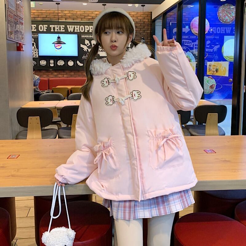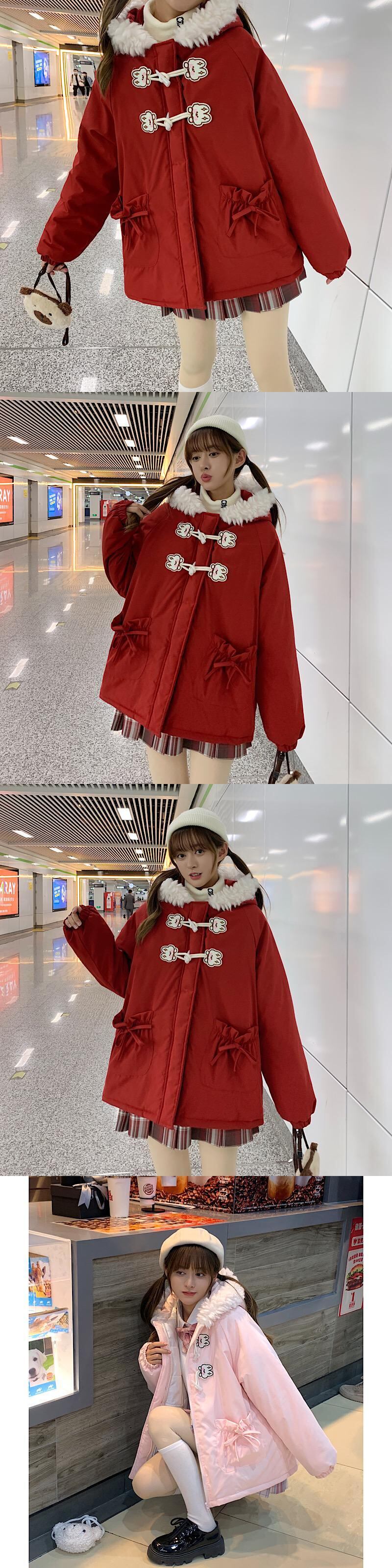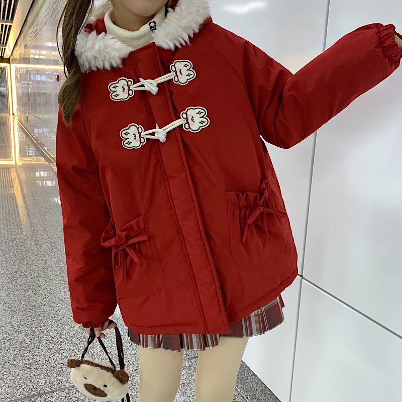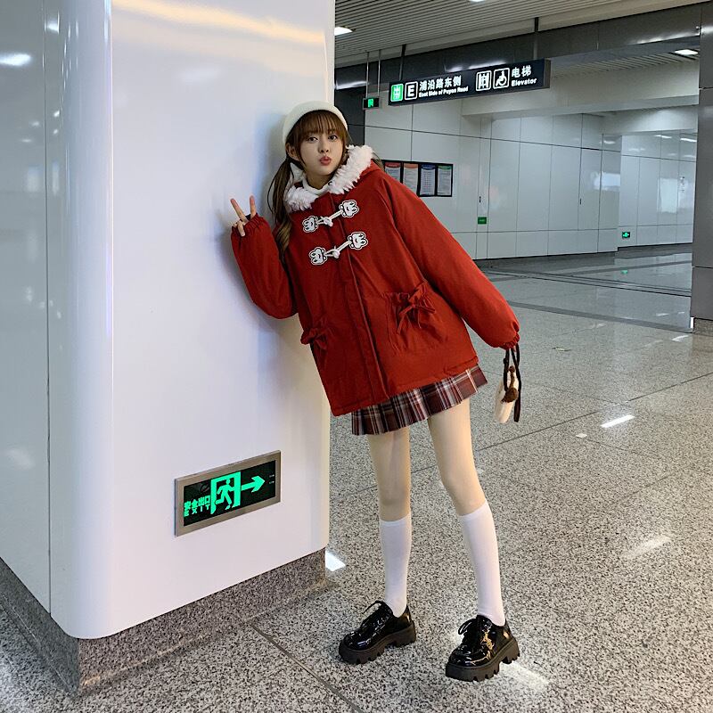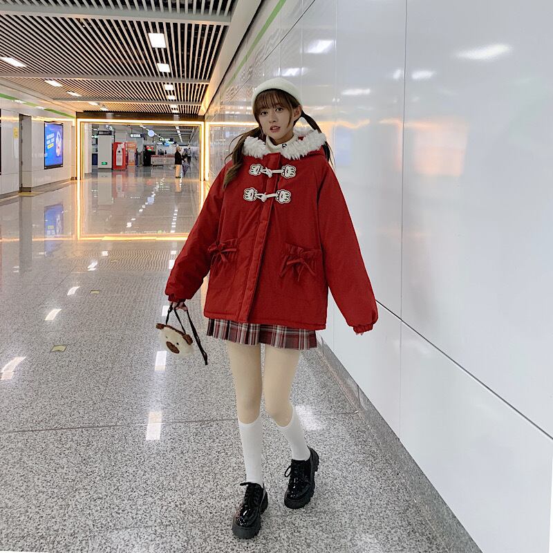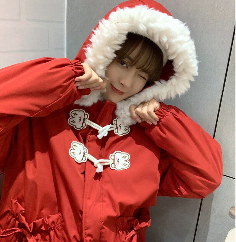 ウィンターレッドコート レディースベルベットルーズファーカラーフードジャケット コットン 冬物 萌量不足72851012383