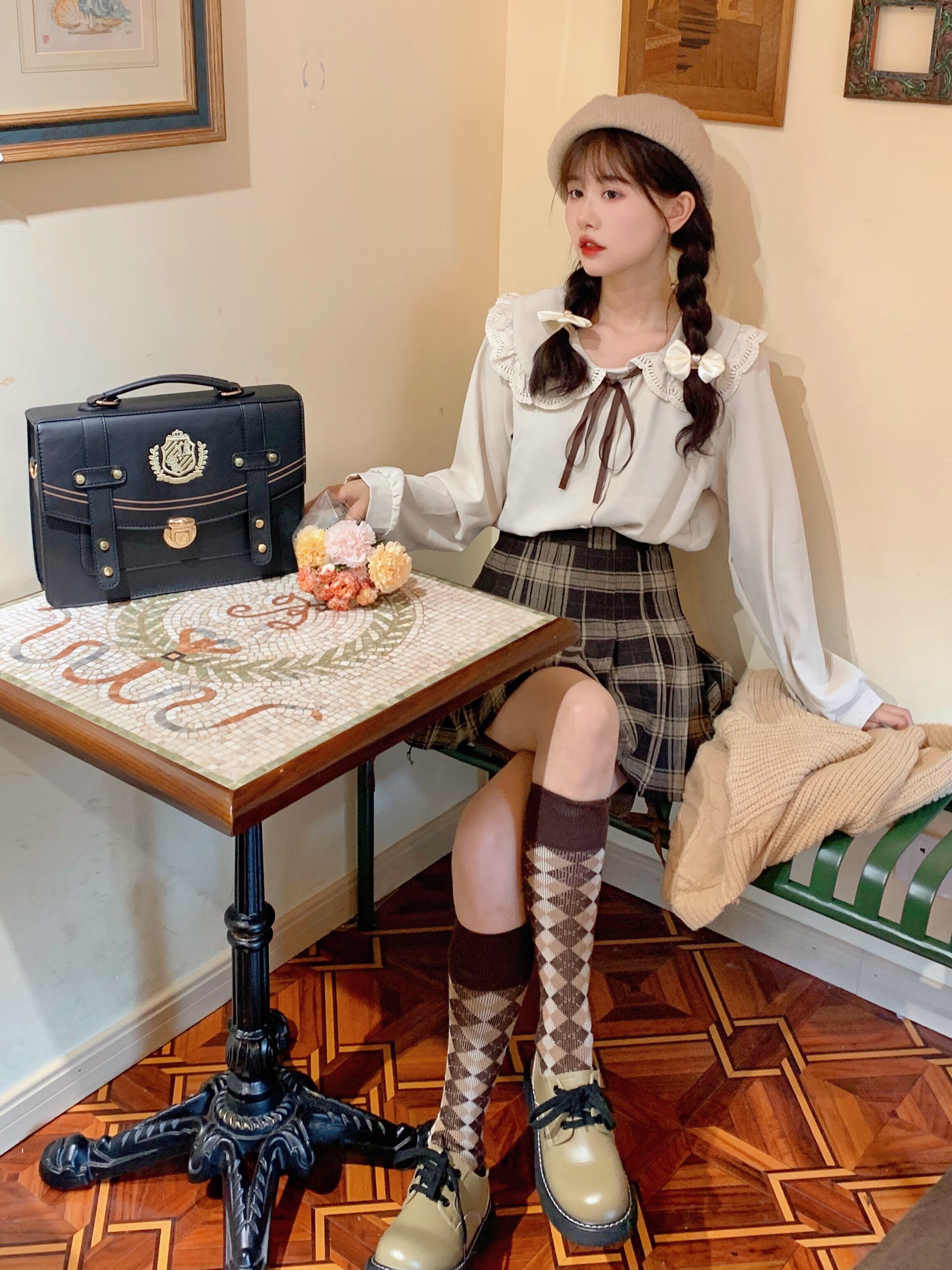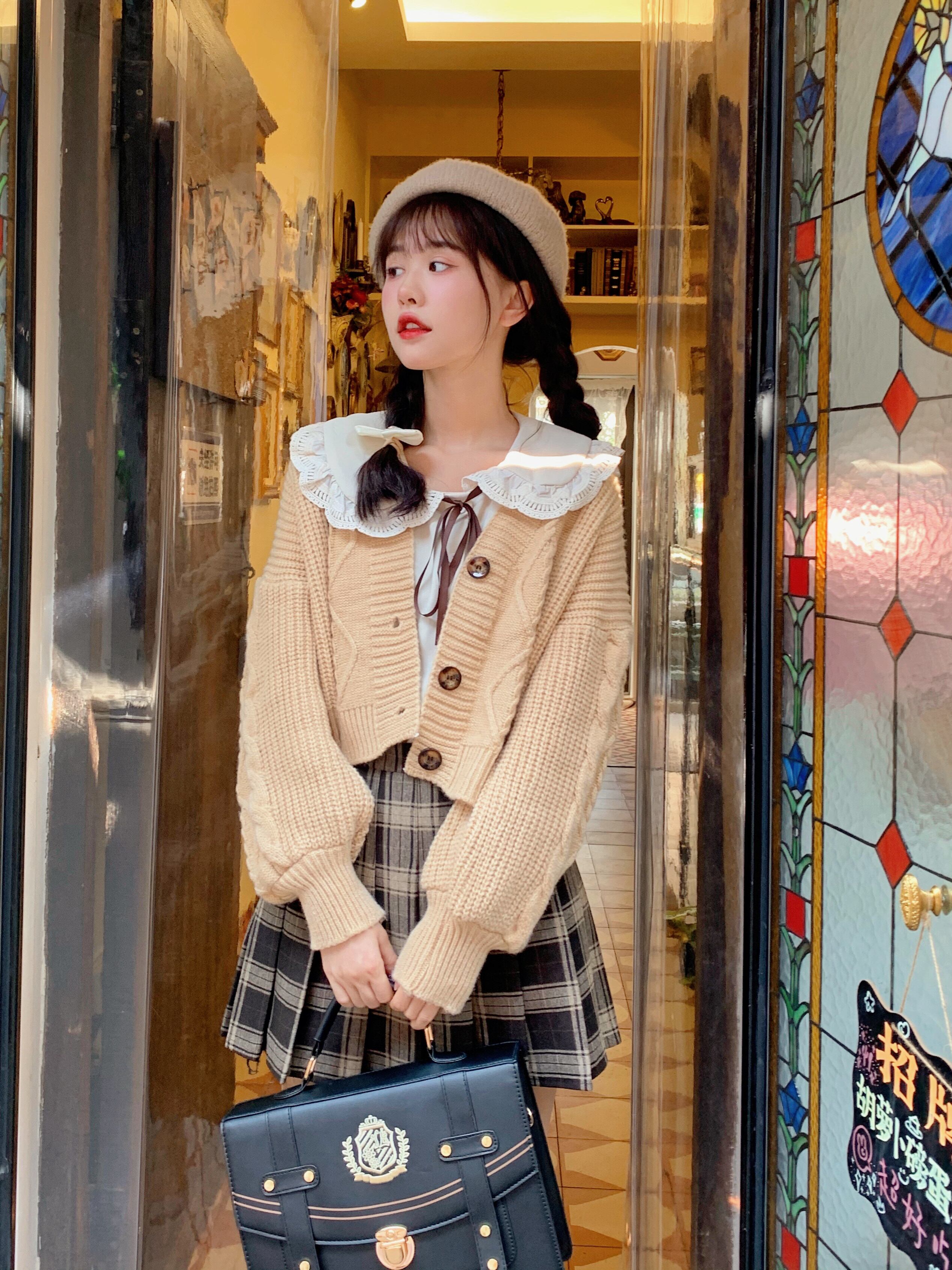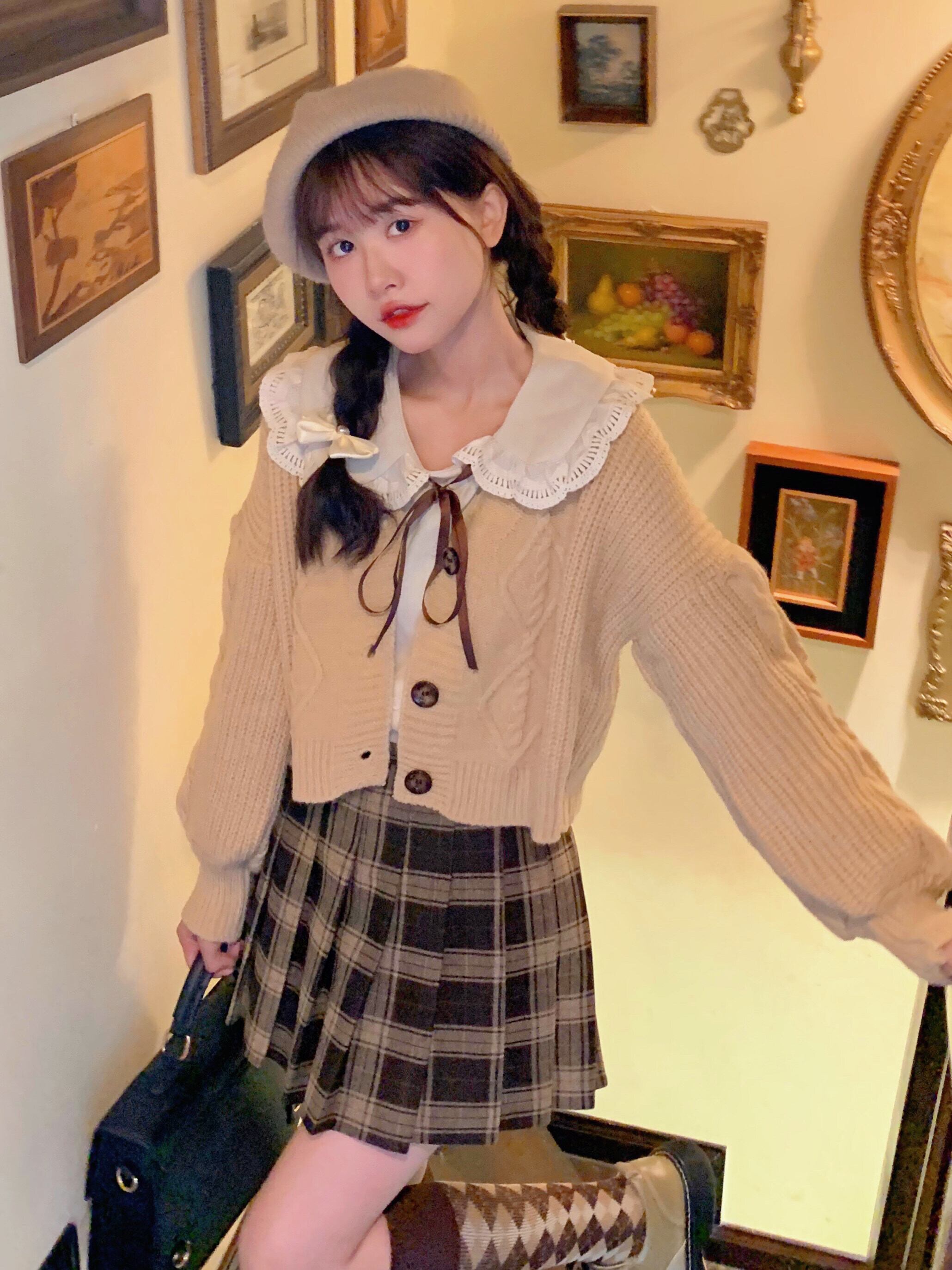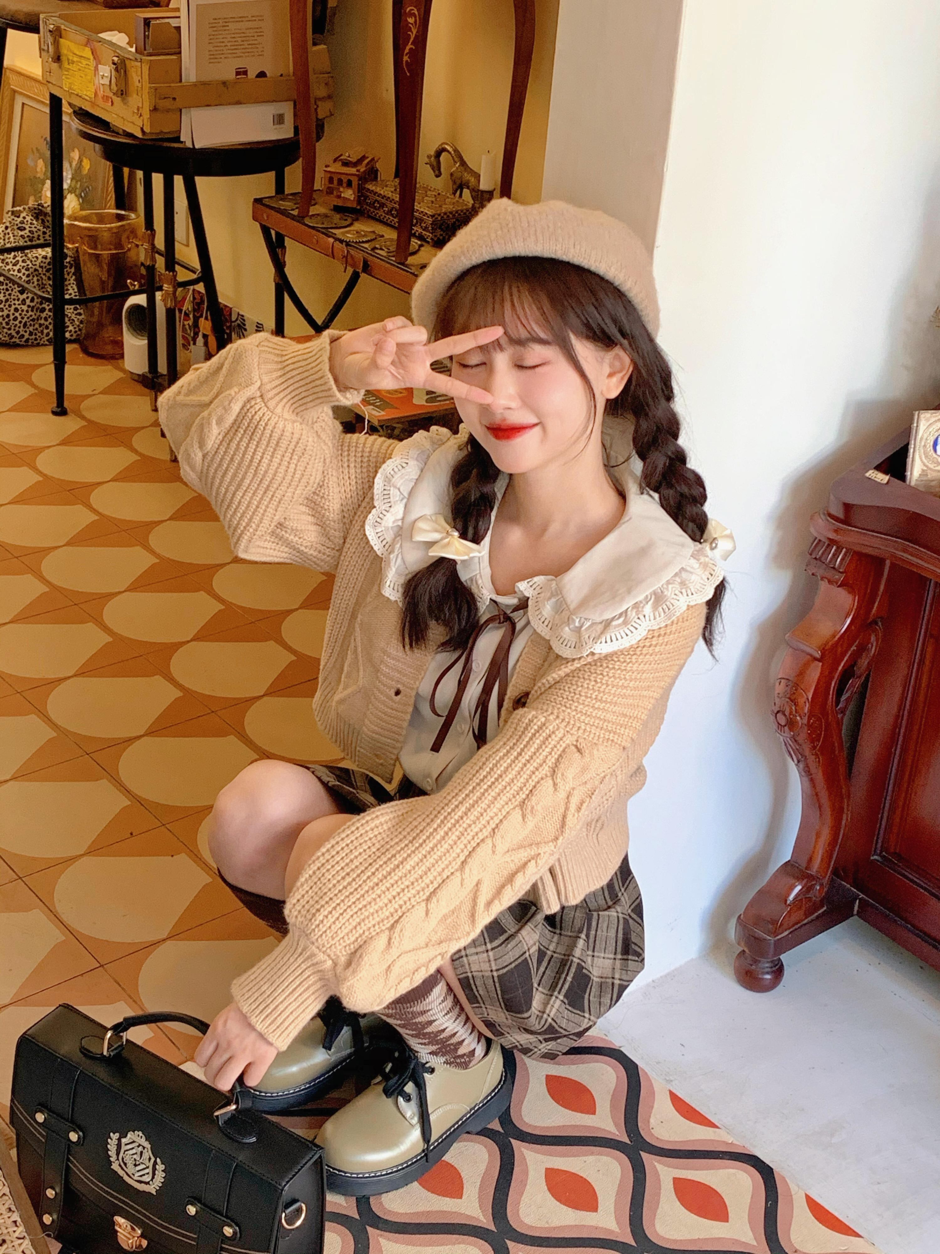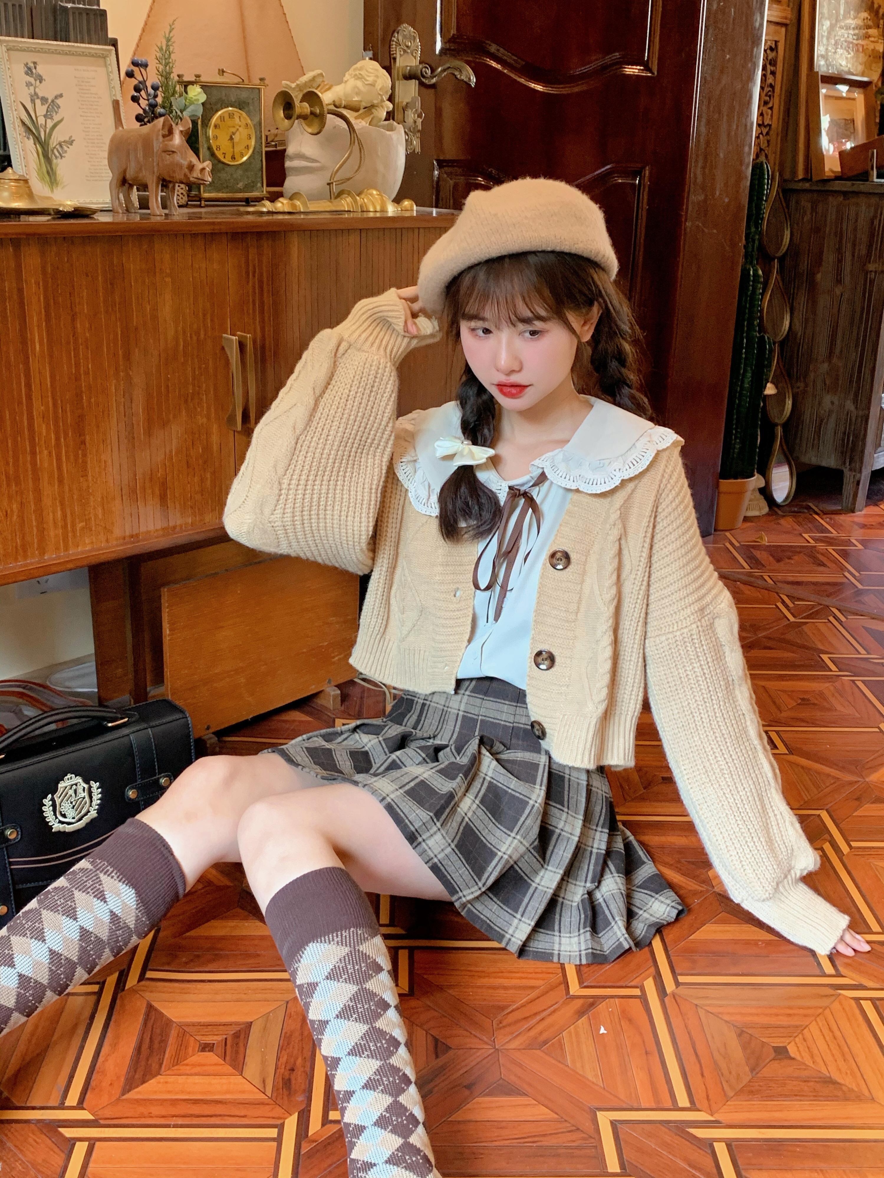 色:アプリコットシャツ,カーキ色のセーター,ウールチェック柄プリーツスカート